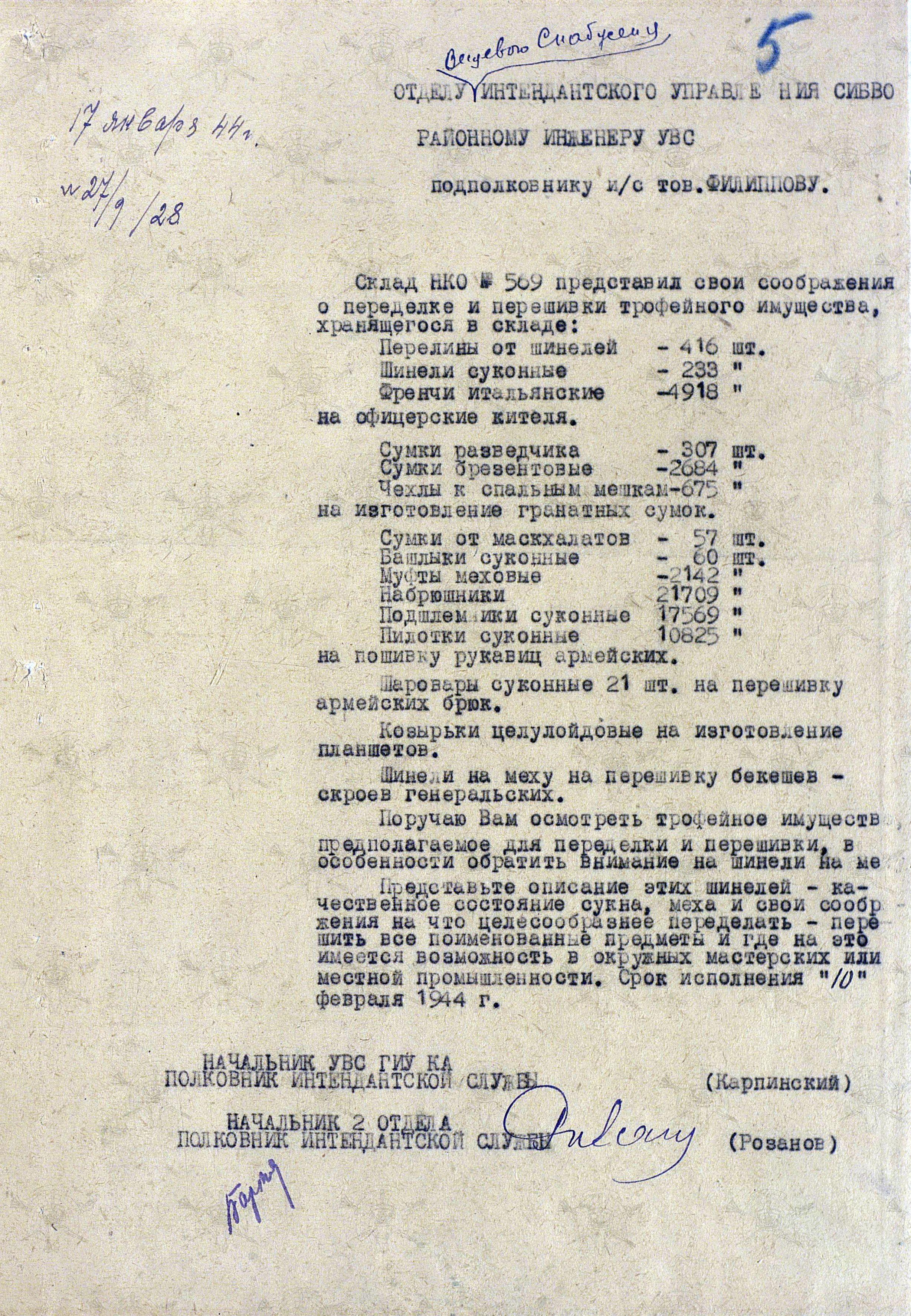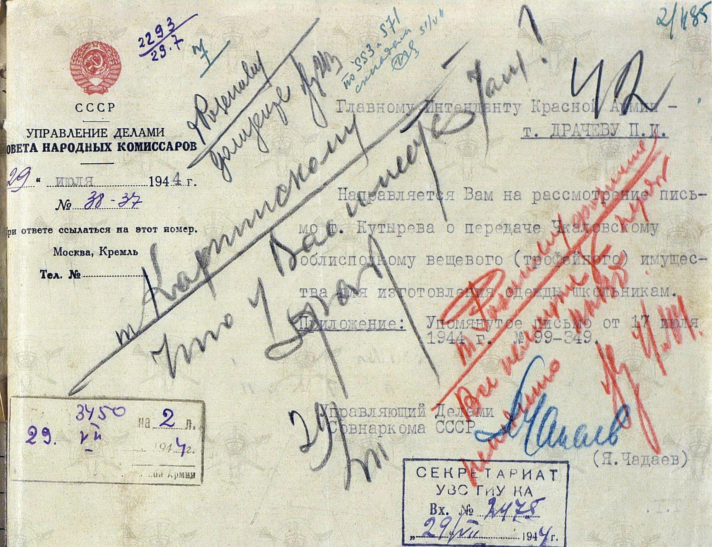 Председатель Облисполкома просит передать им с центрального склада № 553 (г. Оренбург) 50 тонн трофейного вещевого имущества. После тщательной стирки, покраски в черный цвет, и перешивки обмундирования, школьная форма установленного образца должна была выдаваться остронуждающимся школьникам, в первую очередь детям фронтовиков.