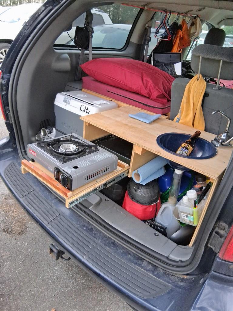 Сзади уместились холодильник, газовая плита с баллоном, раковина с водой и сбором слива