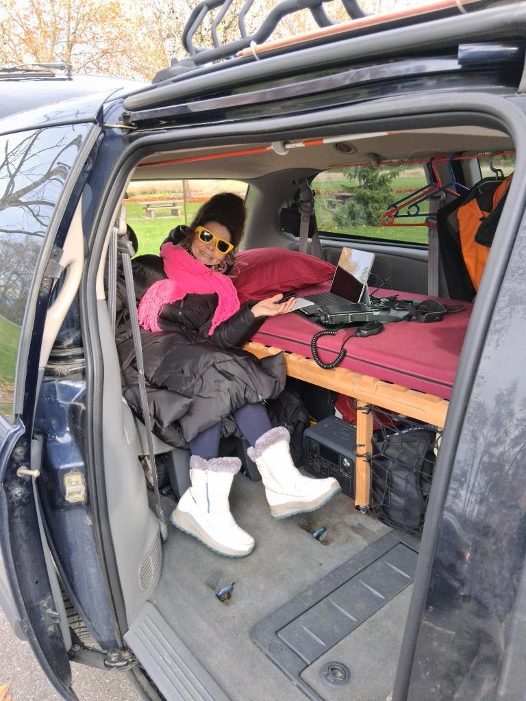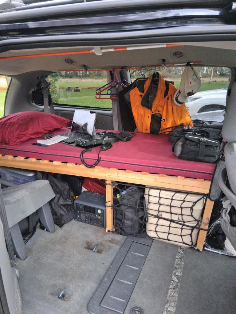 Лежанка с биотуалетом и преобразователем напряжения под ней может использоваться как стол, на столе лаптоп, коротковолновая радиостанция. Вот он и антенну поставил, горд, что общается со всем миром.