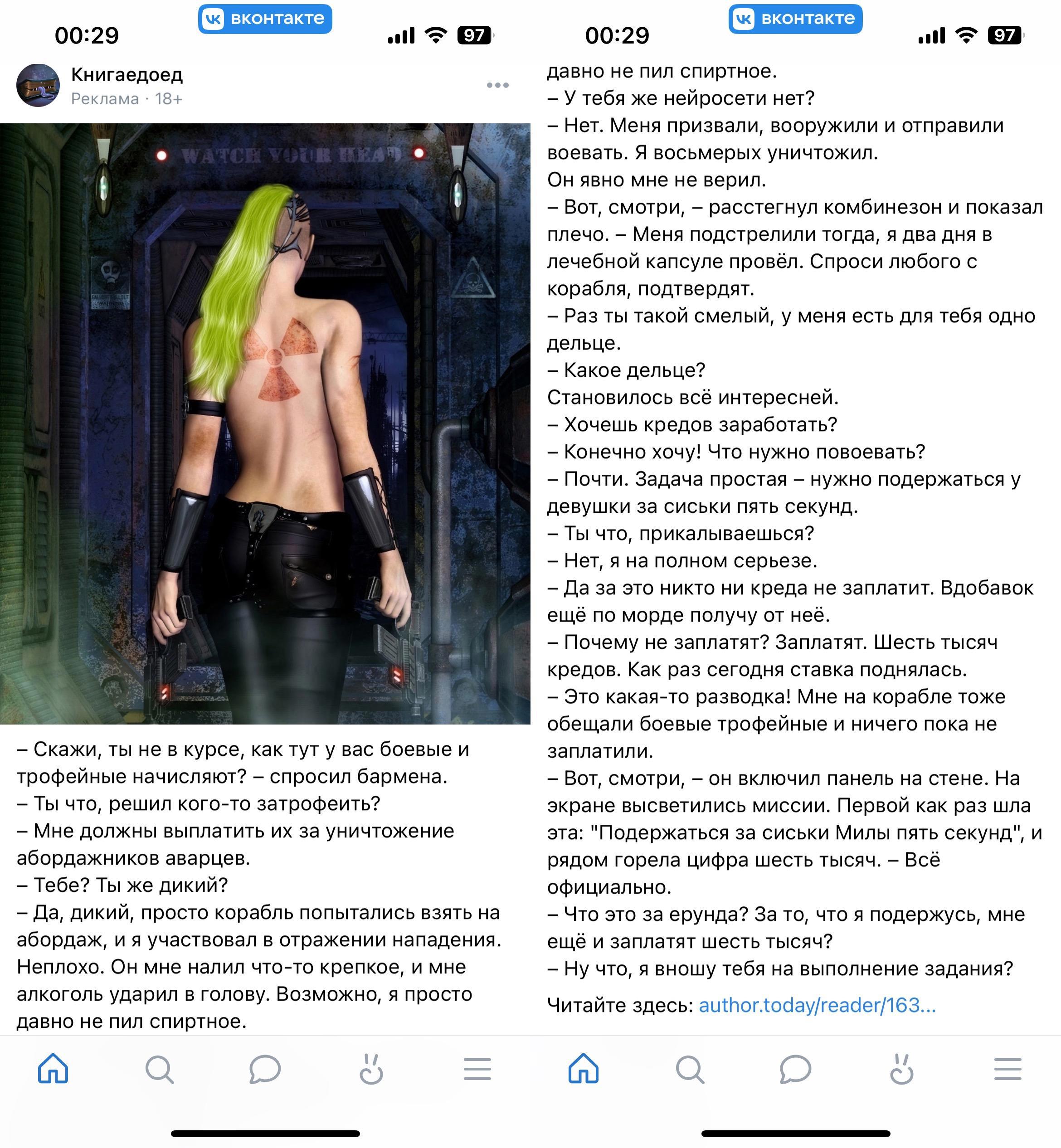 Автор: SangoВообще перлы таргетной рекламы - это классика. Ошибки и опечатки в текстовках? Норма. Картинки не соответсвующие сути книги? Обыденность. Один раз видел даже как в качестве такой картинки спиздили обложку книги с АТ от совсем другого автора…