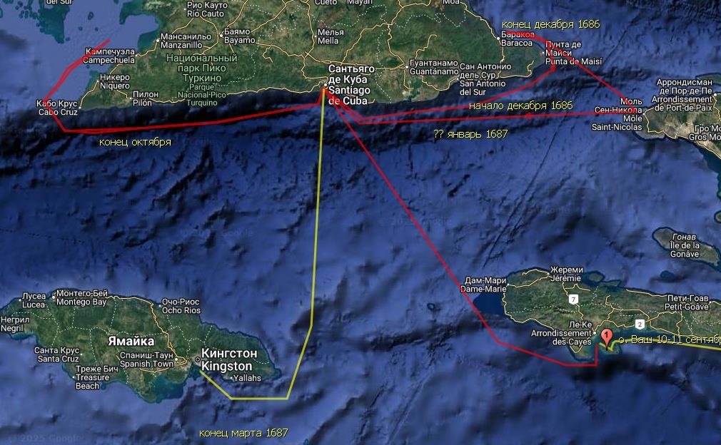 Маршрут, которым Уикер со товарищи выбрался с острова Сальтатудос (Ла Тортуга). Желтым - как свободные люди, красным - рабами на испанском капере. (Даты приблизительные)