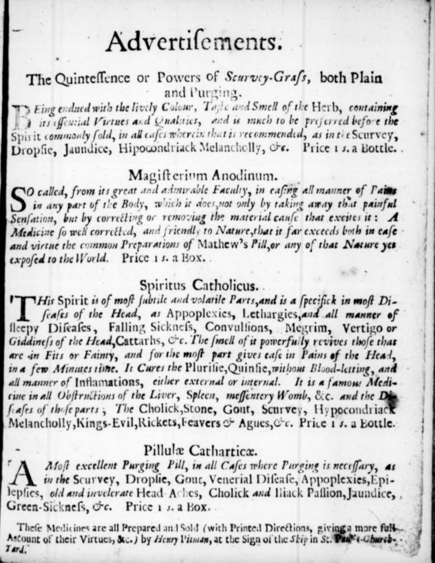 Уже в XVII веке ни одна газета не могла обойтись без рекламы. В сём историческом документе, на последней, 39-й странице, таких рекламных объявлений несколько. Мной переведено только первое. И, если кому вдруг интересно, например, средство от цинги и…