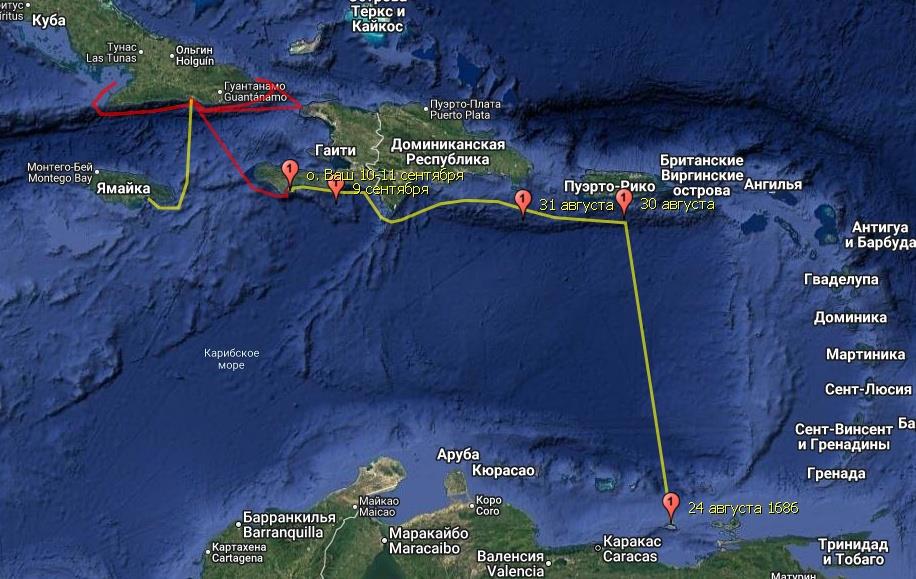 Итак, пополнив припасы и запасы воды на нашем небольшом судне (ориг: small Frigot) наилучшим образом, как только могли, мы оставили их на острове и 24 августа отбыли с Сальтатудоса, и примерно через шесть дней достигли острова Пуэрто-Рико, но наш лоцман, не будучи хорошо знаком с теми краями, принял его за возвышенность Санто-Доминго на Эспаньоле и потому приказал положить руль и уйти на запад по ветру; на следующий день мы не увидели земли; что причинило немалое беспокойство среди нас, ибо мы не знали, где находимся.