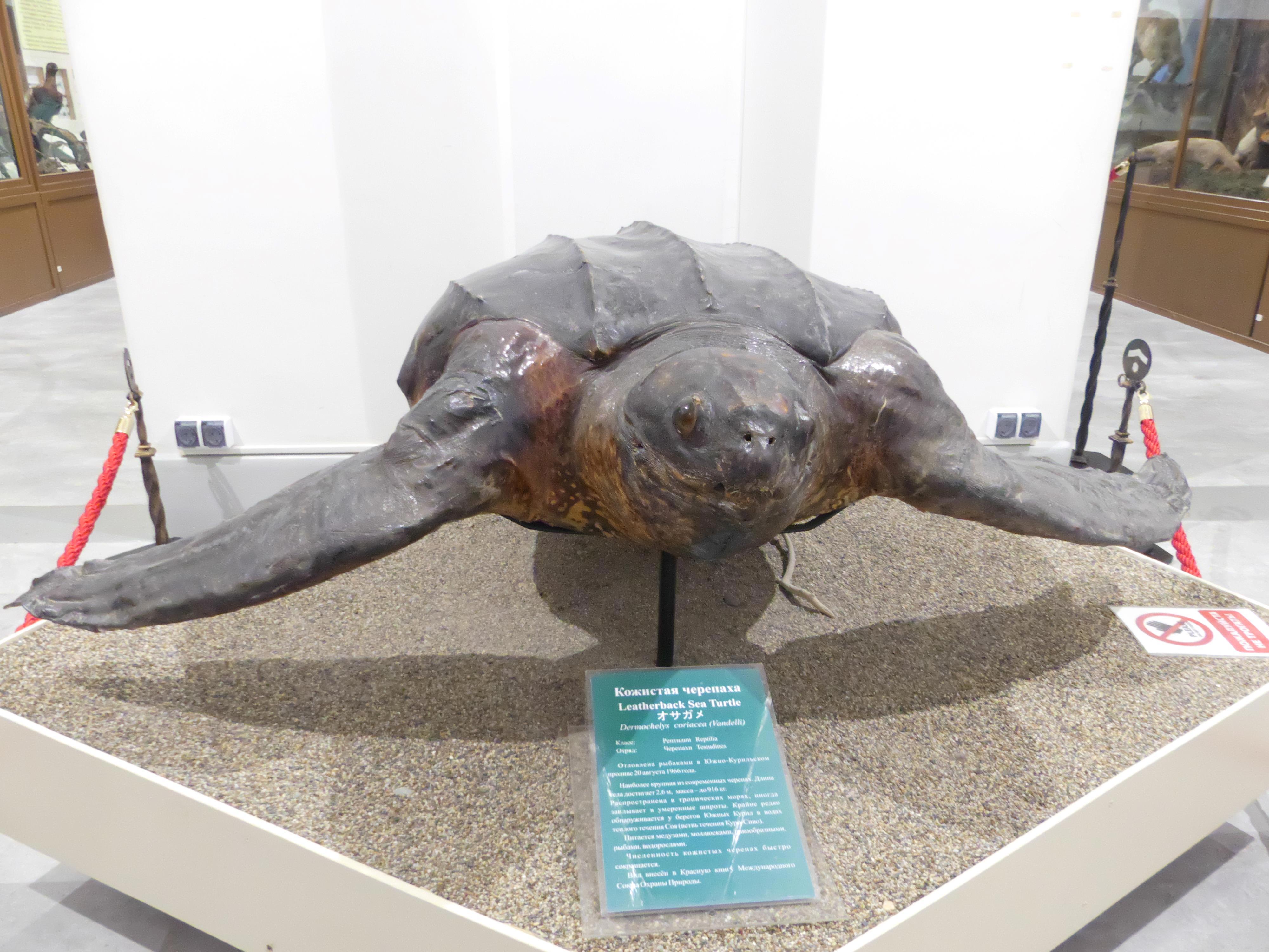 К примеру, вот такая кожистая черепаха плавает в сахалинских водах.
