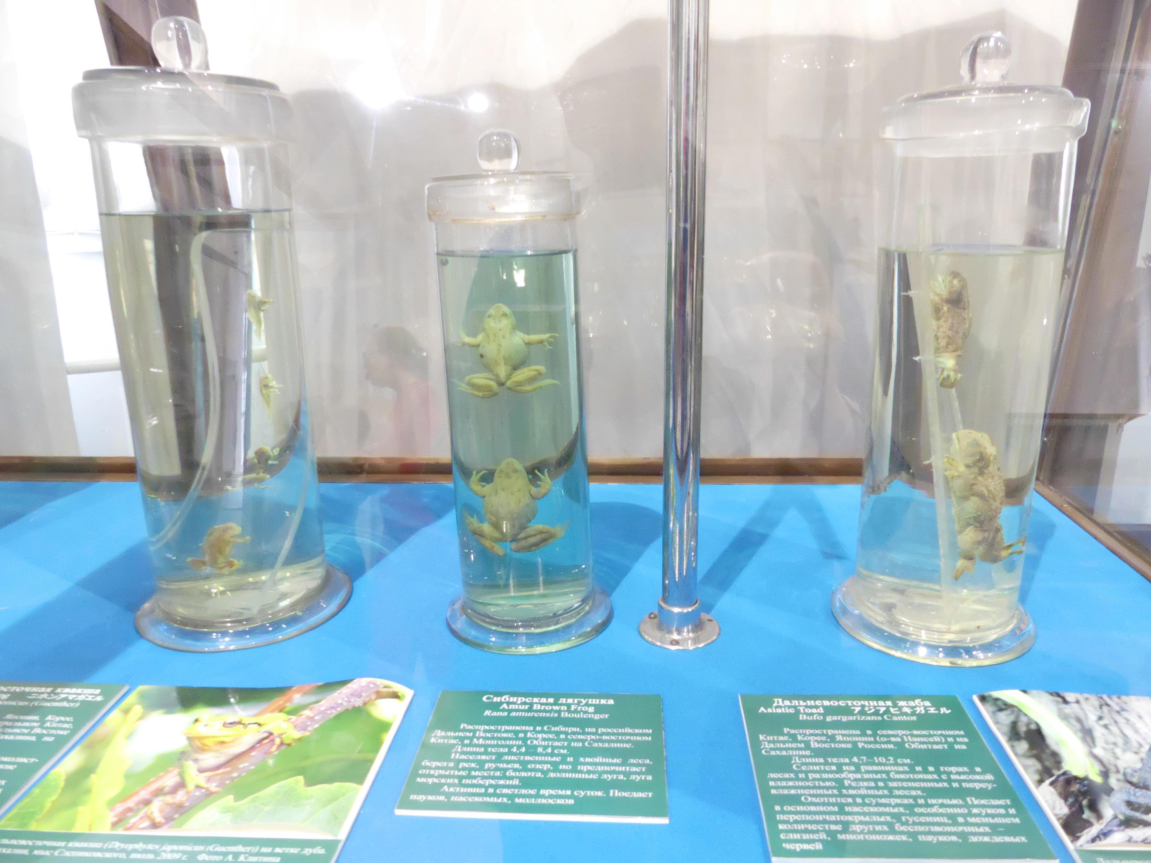 Заспиртованные земноводные - сибирская лягушка и дальневосточная жаба.