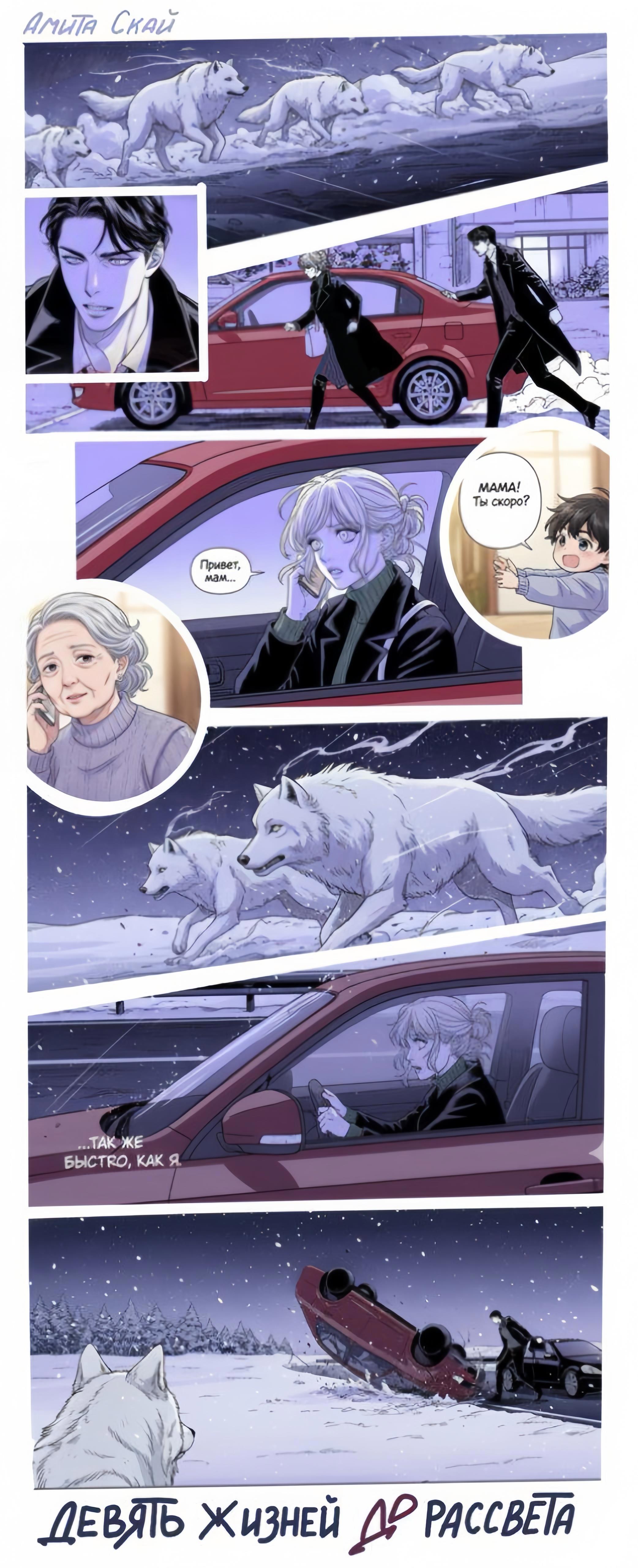 Сделала комикс к первой главе "Девять жизней до рассвета", с помощью ИИ. Поделитесь вашим мнением, если такой формат понравится, можно будет попробовать, еще что-то подобное сделать.