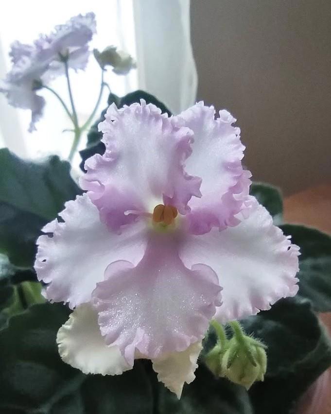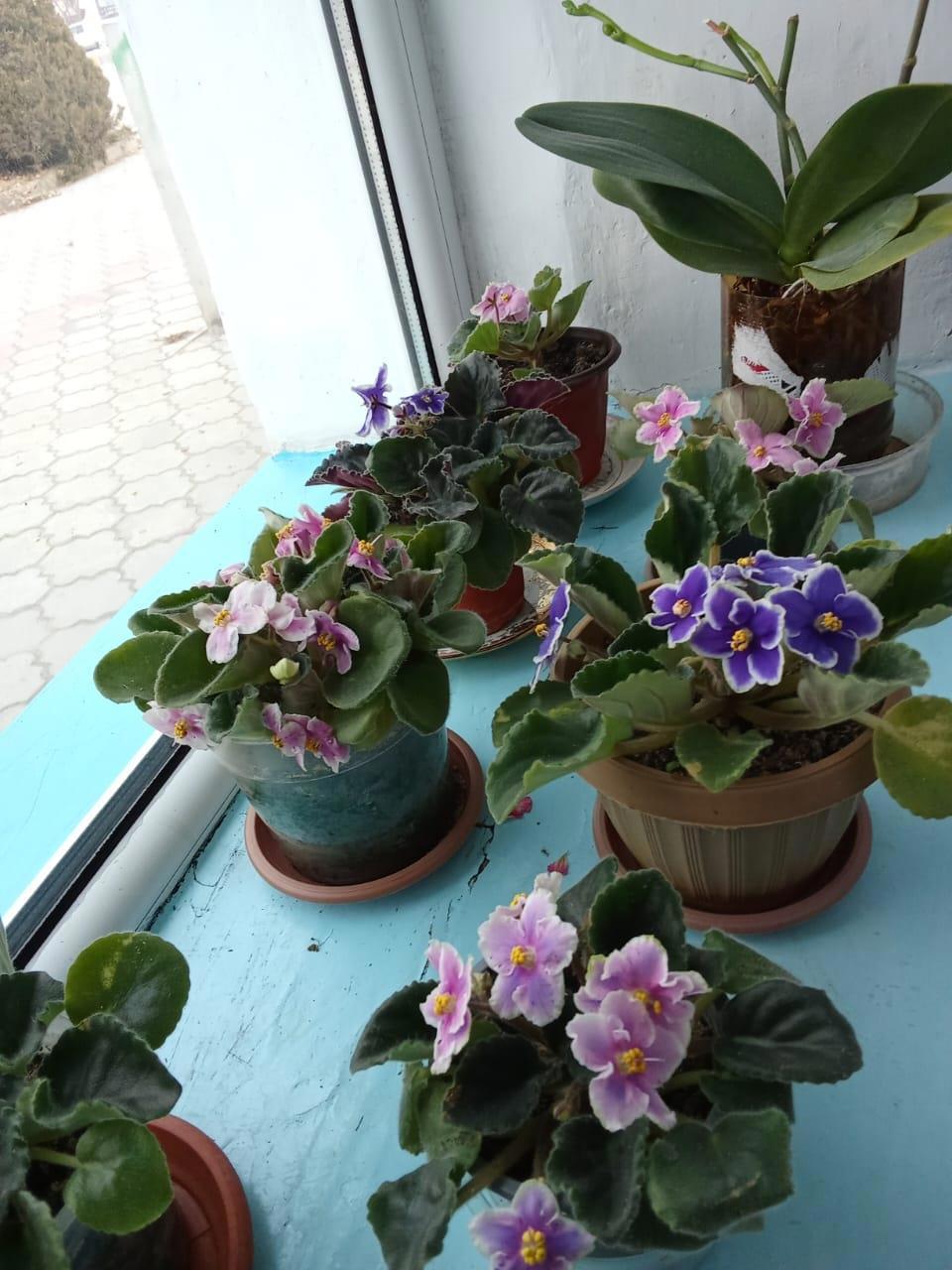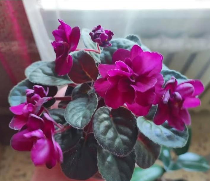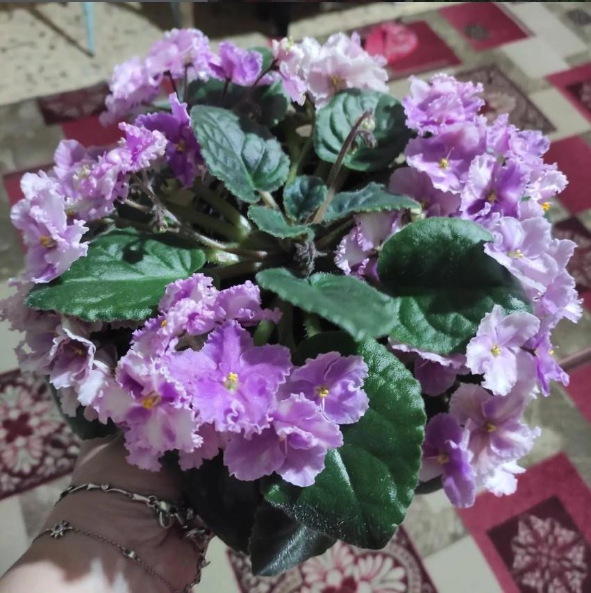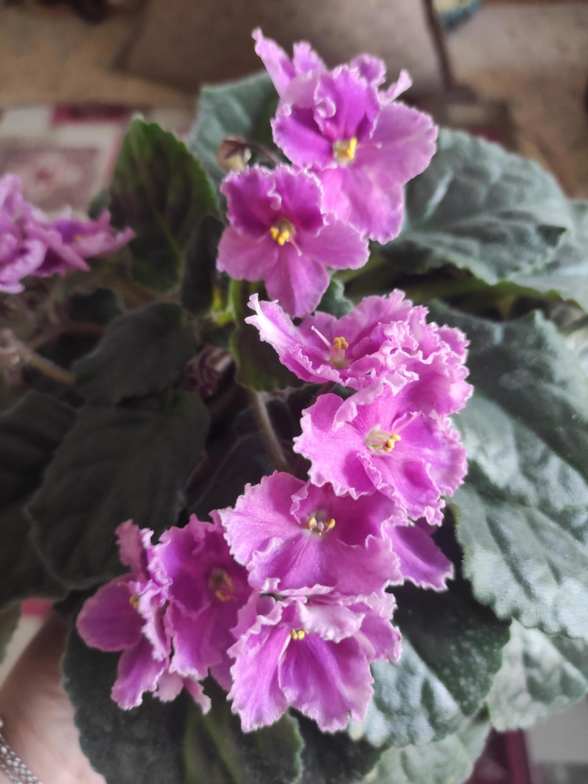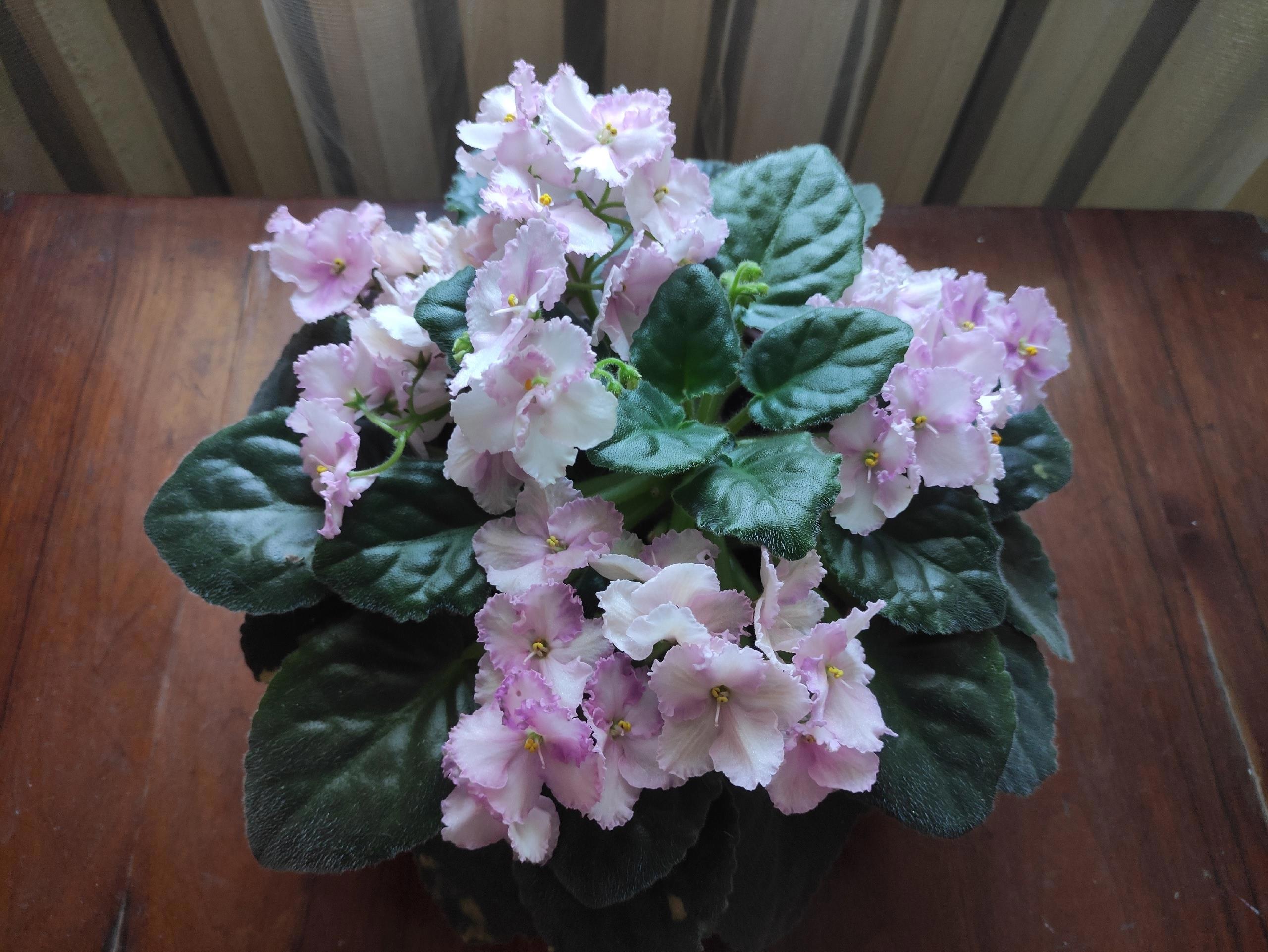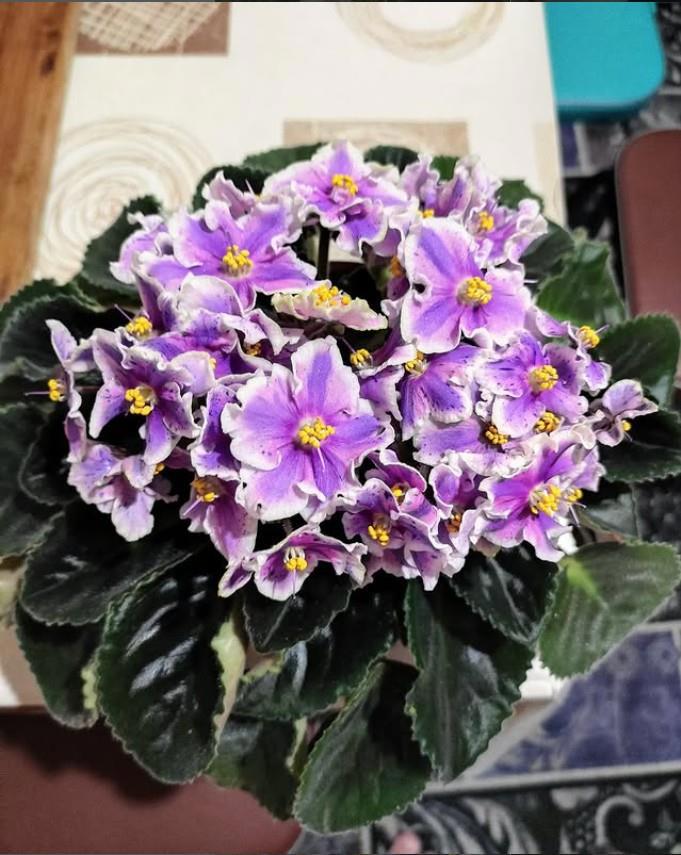 🧷Астро Спиннер (кажется? в расщепе с листа дала аж три варианта цветков: розовые с крапом, розовые со спиннером и крапом, фиолетовые с белым краем - похоже, все предыдущие сорта, которые и дали этот). Мощнейший куст, деток не дала, у меня лист не очень укореняется, а вот у мамы - великолепно, сразу с кучей детей. Воды не боится.