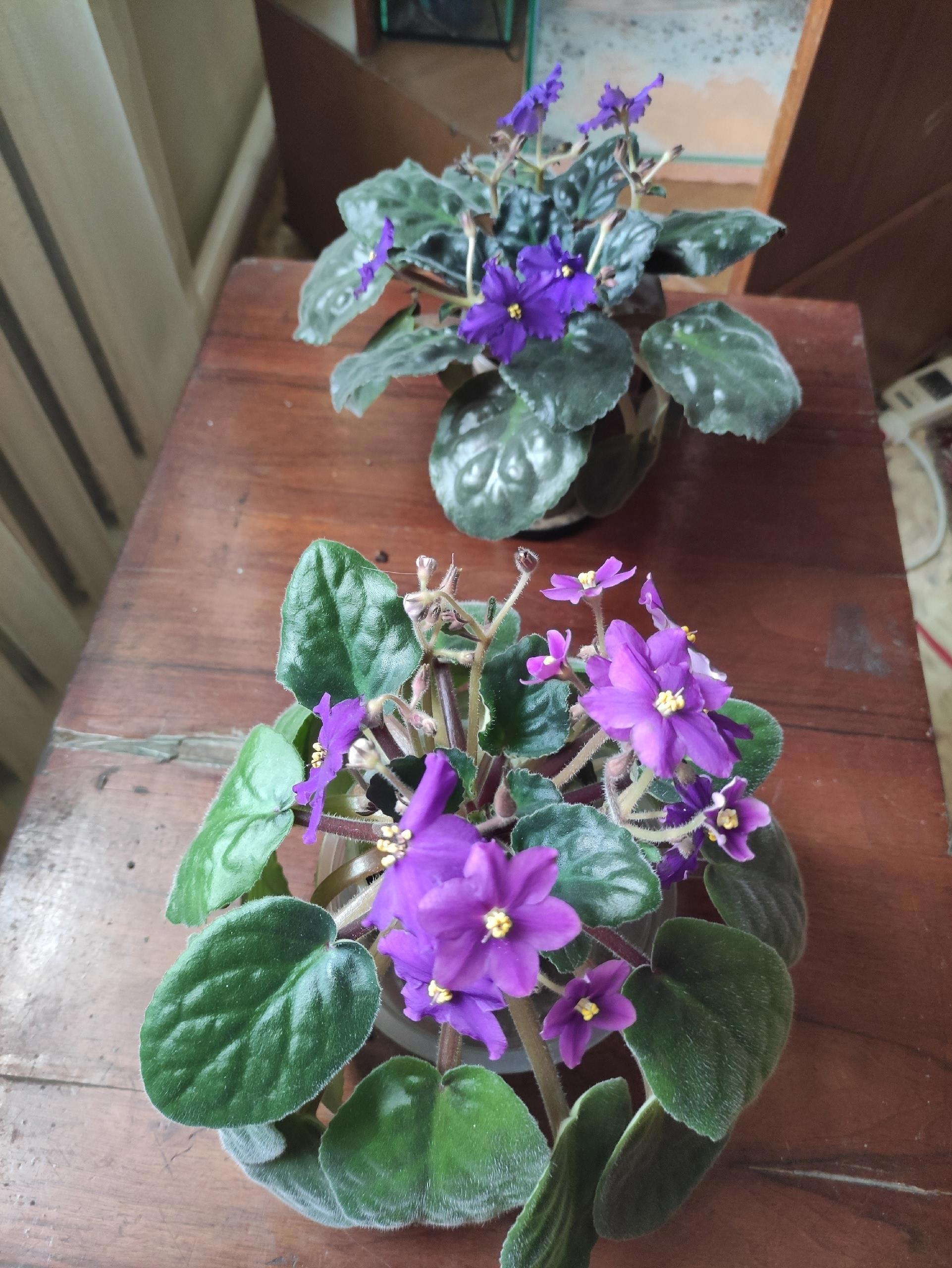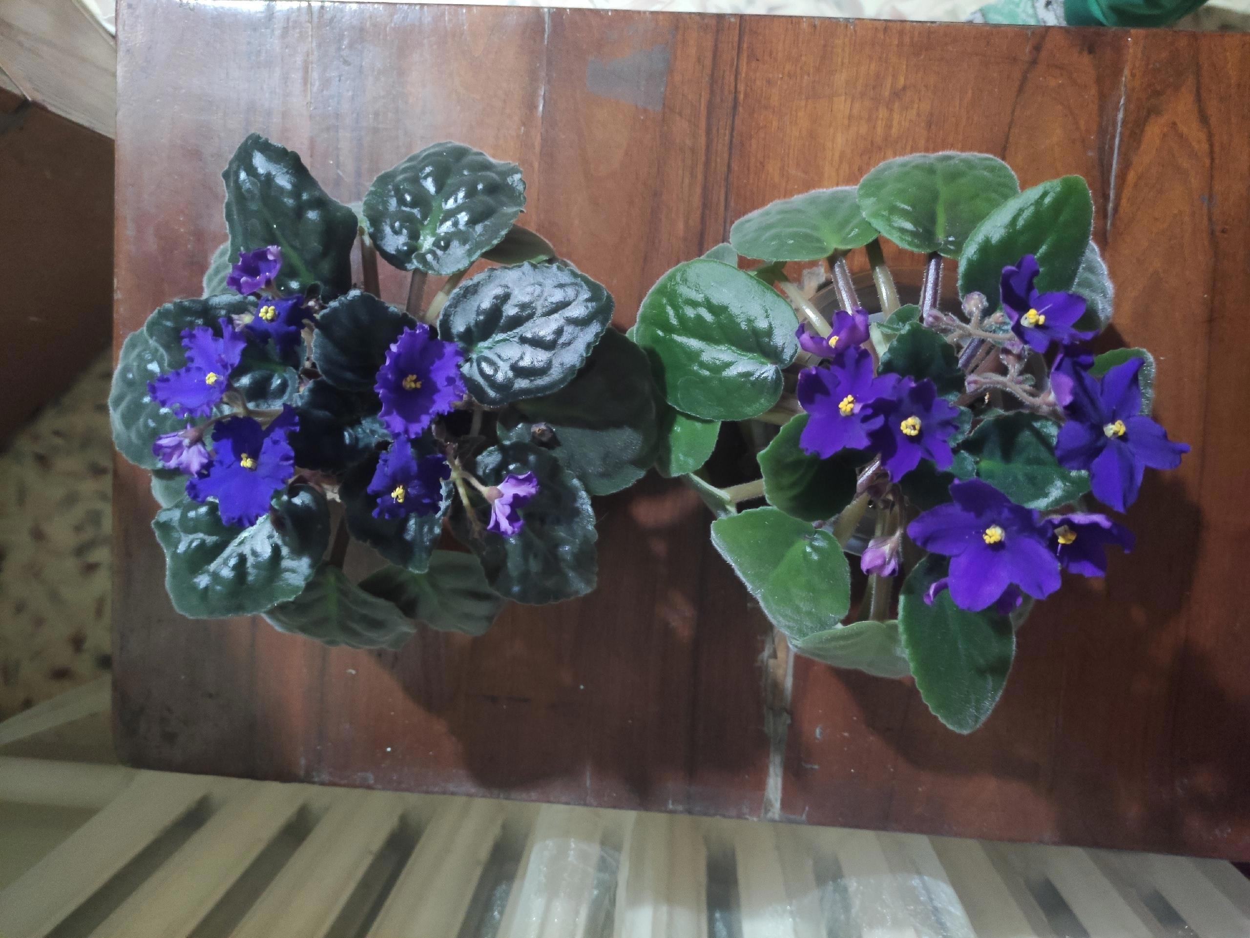 Вот начало цветения, чистая Афроночь слева, у нее более зубчатый край и темнее оттенок цветка и листа. А потом стало так: