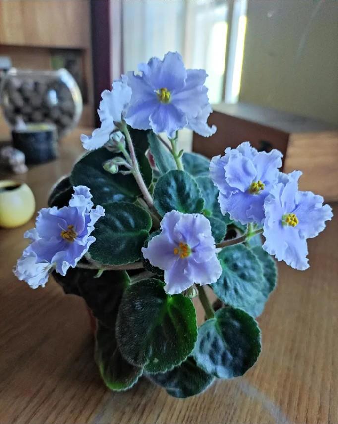 🧷Африканская ночь. Цветки огромные, но держатся на цветоносах слабо. Деток не дала, зато на семена щедрая. Посеяла, получила 2 варианта: точную копию и светлую, со светло-зелеными листьями и цветами, начинающими цвести с темно-фиолетового до средней сирени на самых последних. Обозвала Рассветом над саванной )) Наверное, с простой сиреневой переопылилась, они рядом стояли на окне.