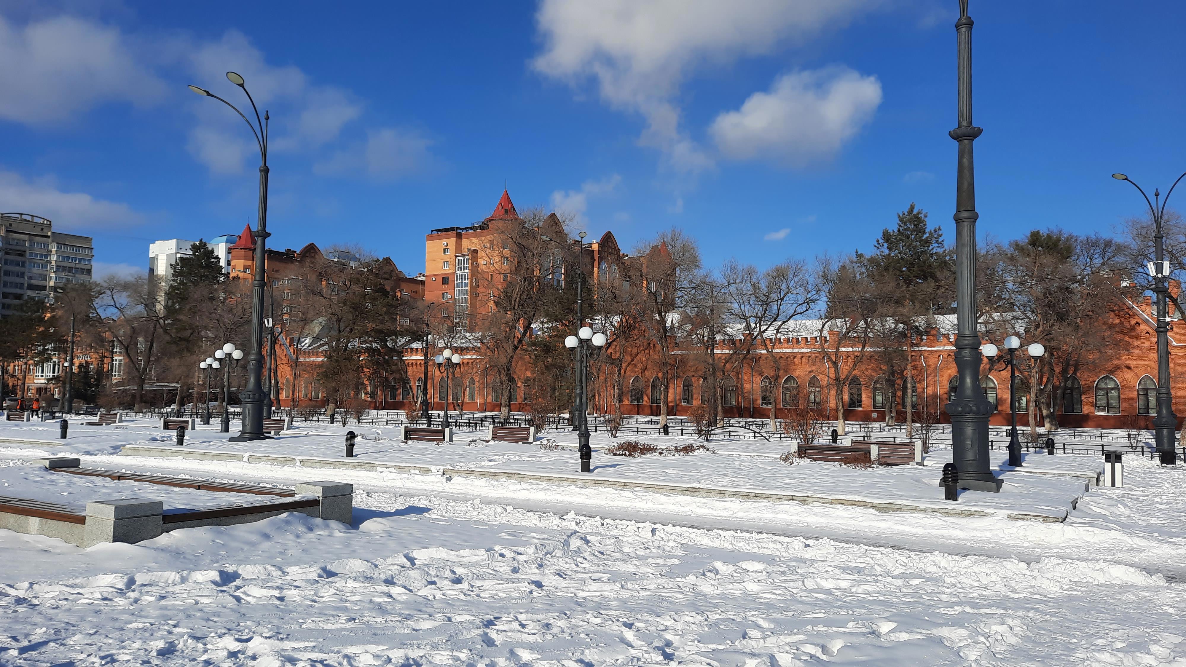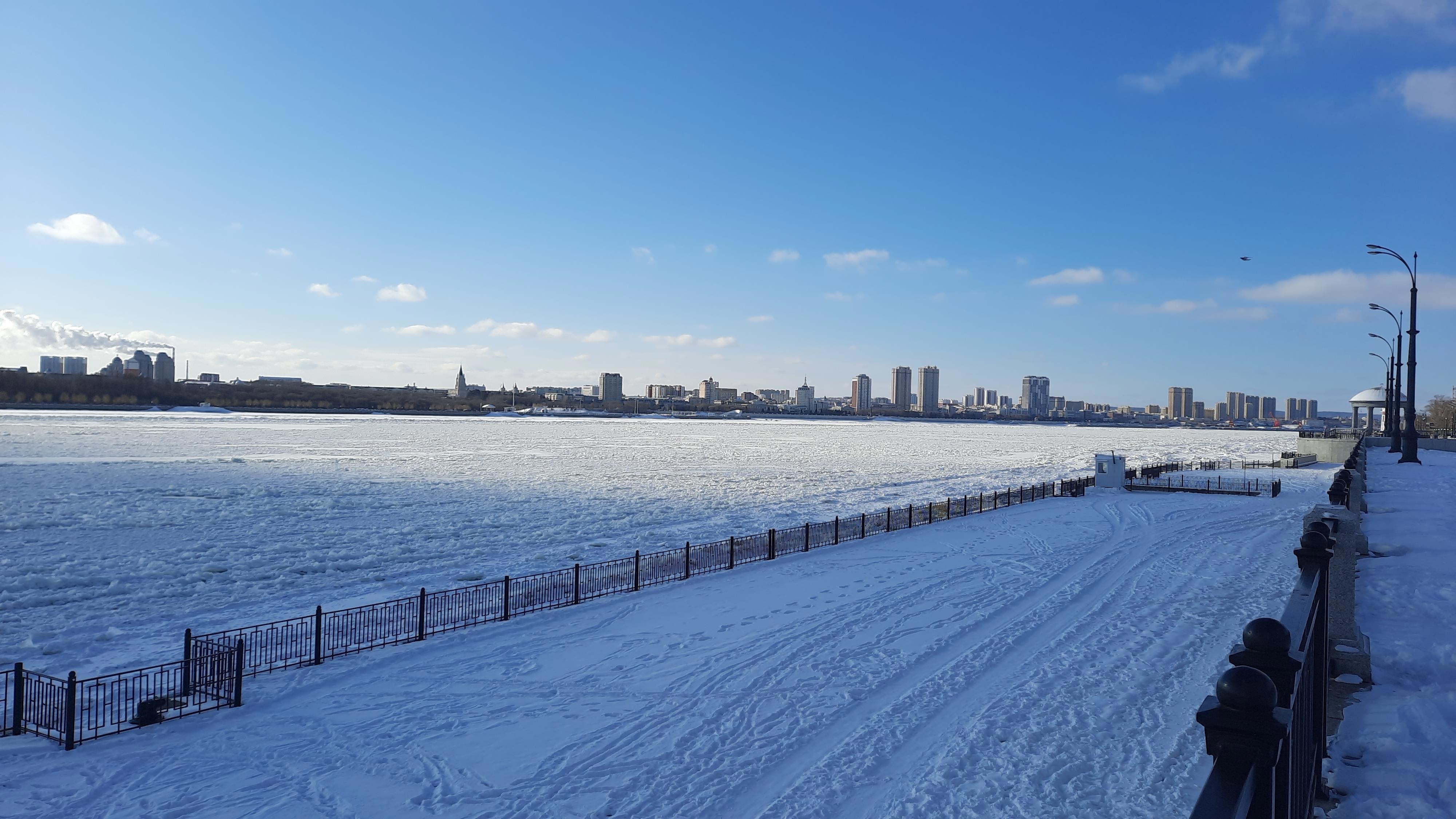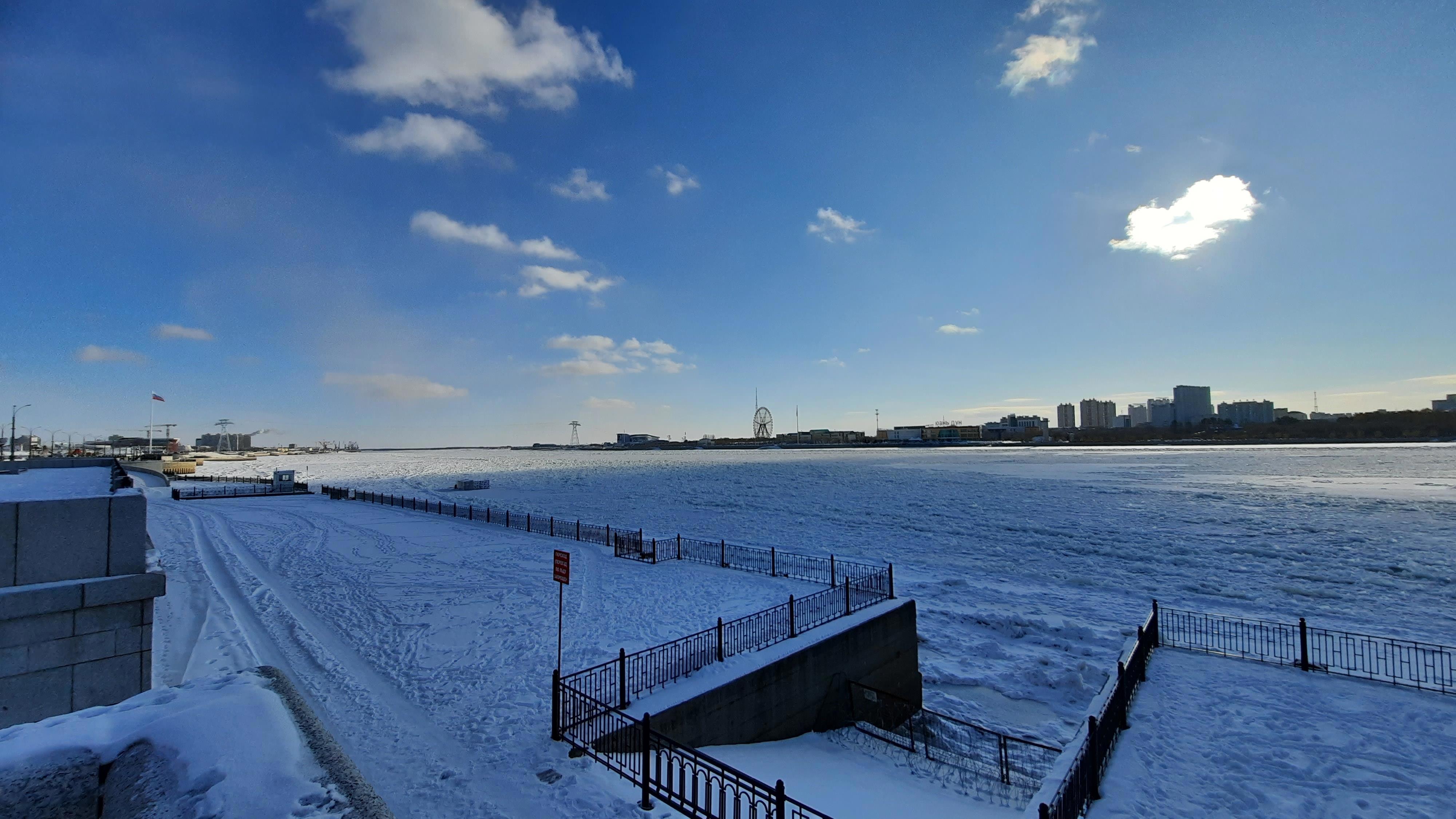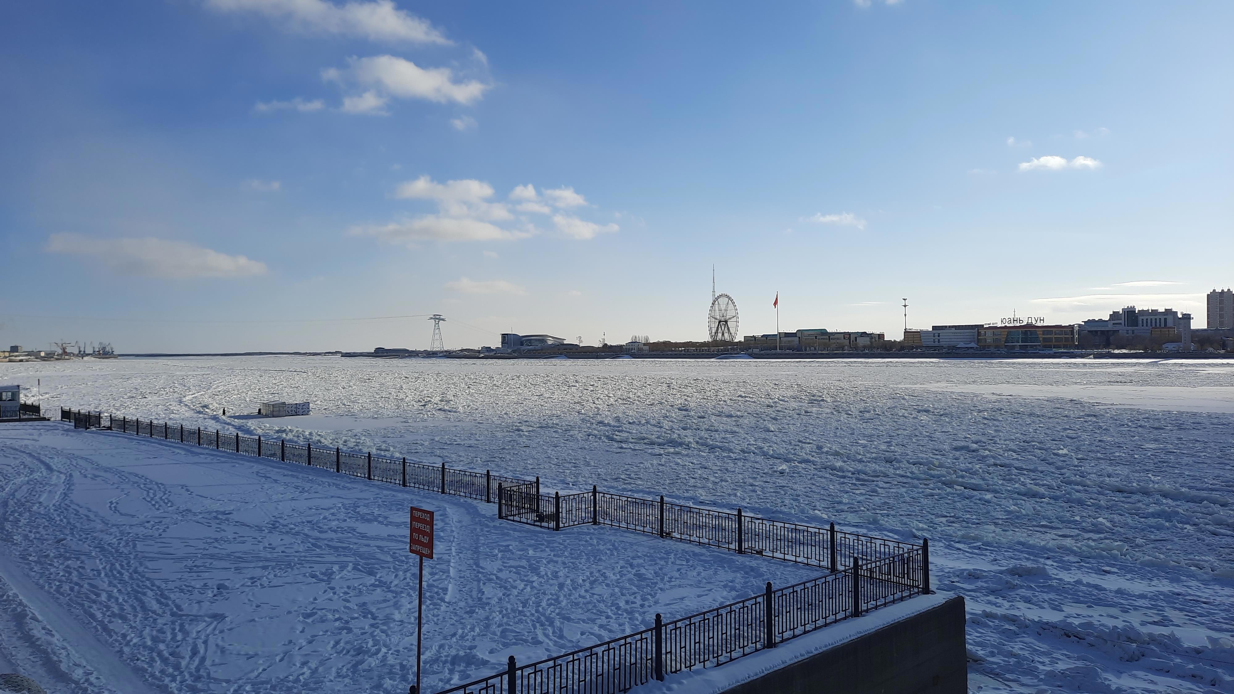 10.12.2025 Амур в районе площади Победы. Река встала, но ещё виднеются полыньи.