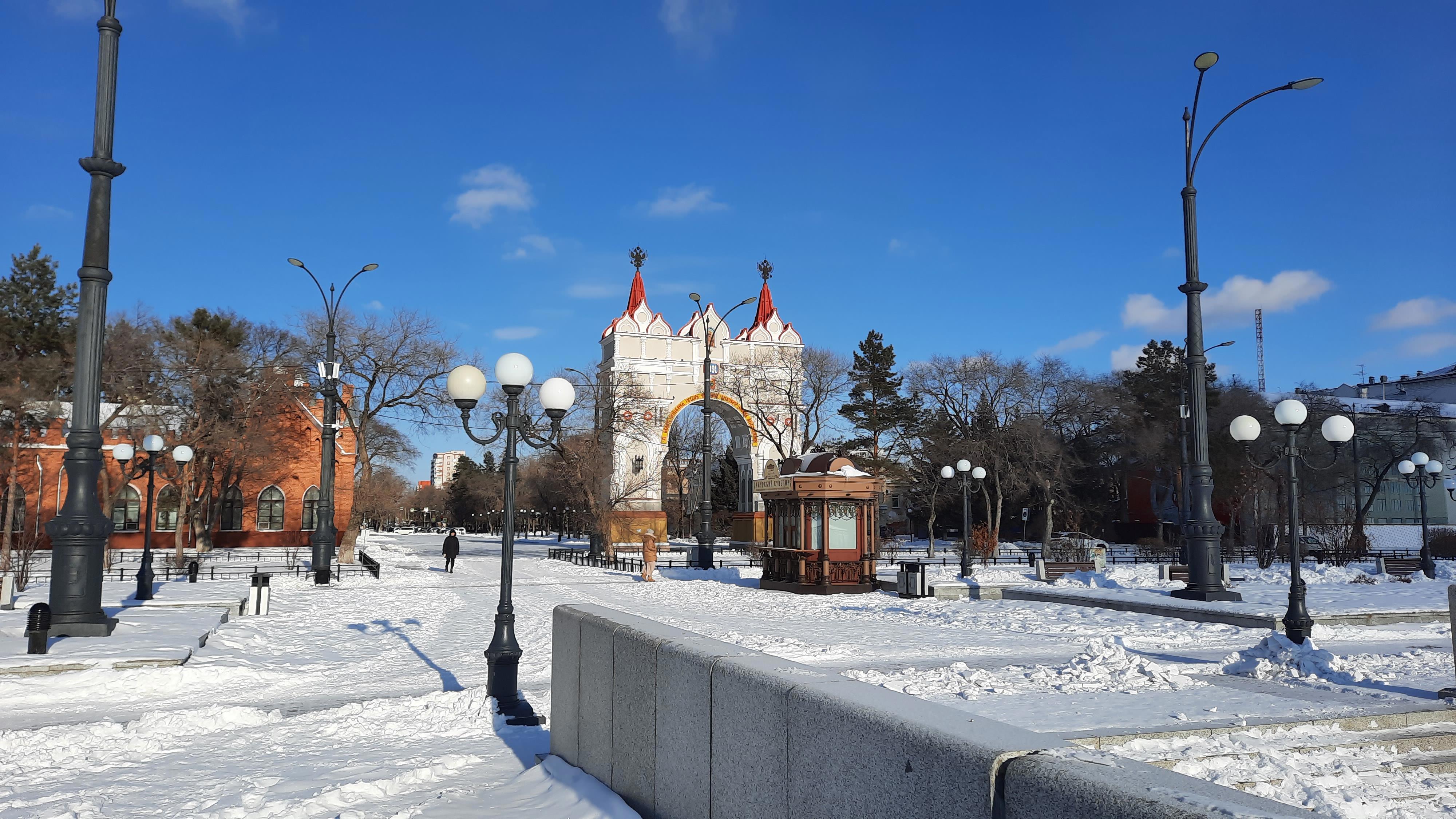 Вид на город с набережной. Триумфальная арка в честь посещения Приамурья цесаревичем Николаем (по дороге из Японии в Питербург)
