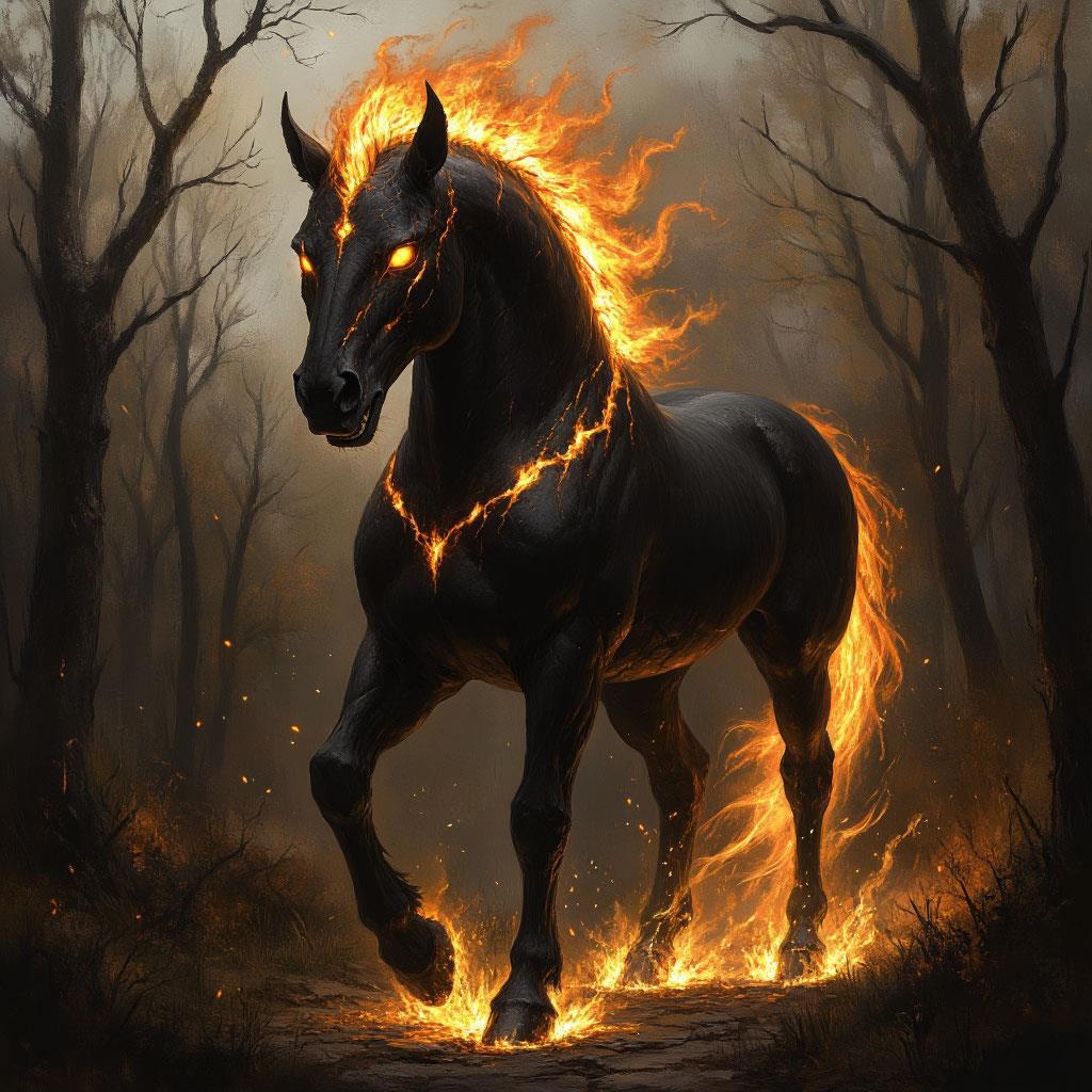 Среди обглоданных деревьев и иссушенной травы показался конь. Или… существо, напоминавшее коня. Черный, под кожей угадывались сильные мышцы. Из ноздрей шел дым. Пасть была чуть приоткрыта, обнажая зубы… совсем не лошадиные. Они походили на клыки хищника. Такие же длинные и острые. Мурашки побежали по спине Атоссы, когда она посмотрела в глаза зверю. Желтые, немигающие. Они внушали беспричинный страх. Конь мотнул головой, по гриве пробежали искры, и точно такие же вылетели из-под копыт, когда он ударил ими по земле.