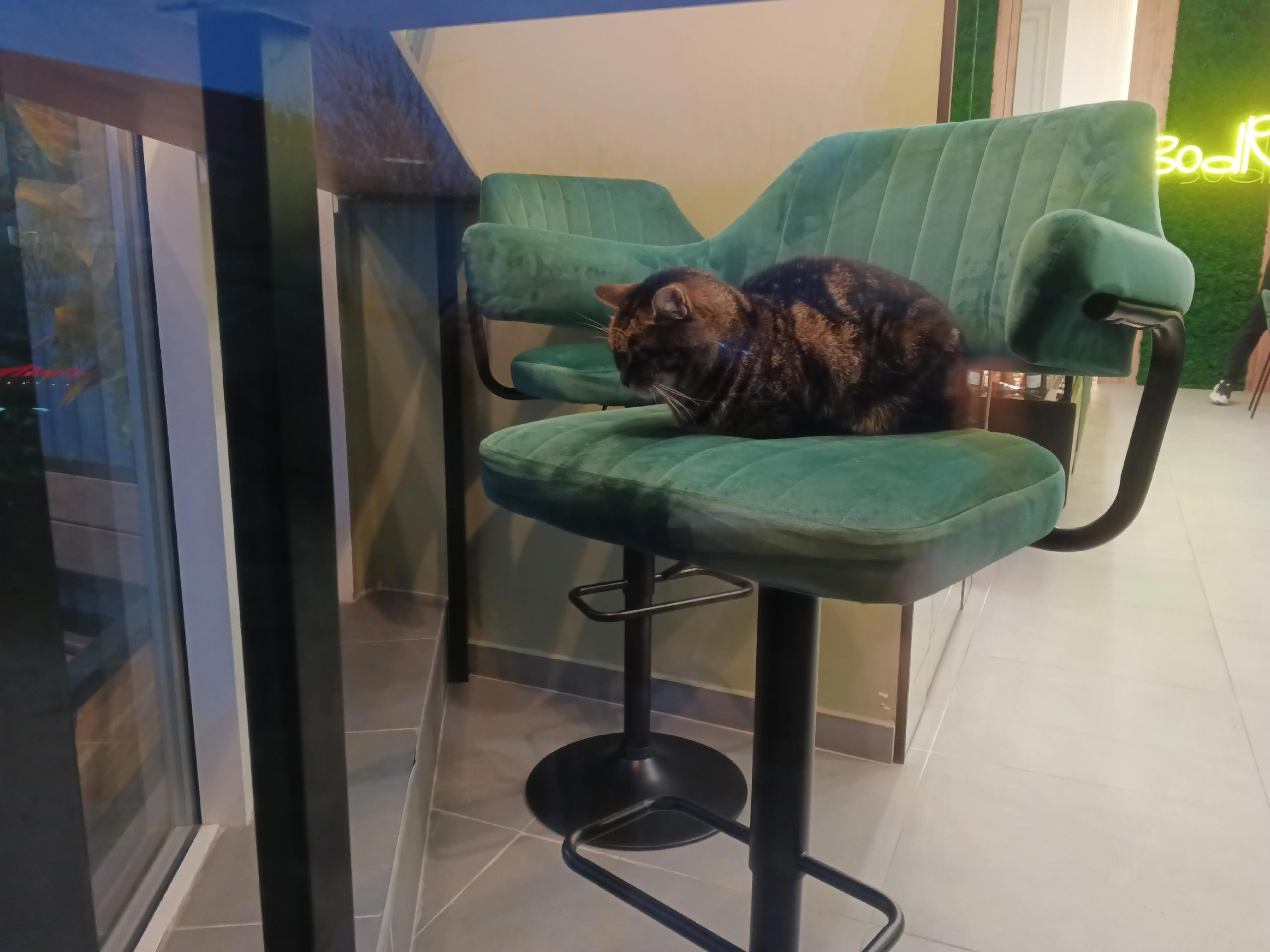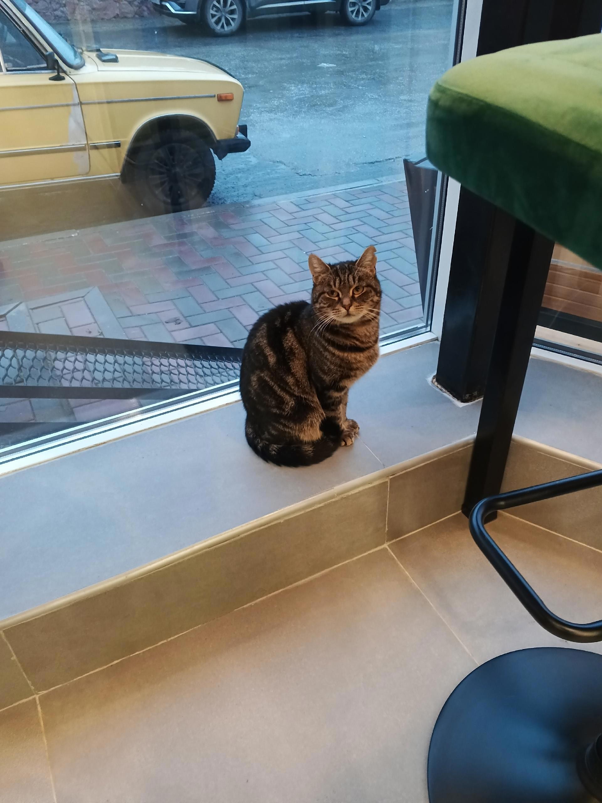 А потом было маленькое происшествие. Как выяснилось, в кафе ходит погреться и подкормиться очаровательная кошечка. Зовут Ксюша, обожает сливки, которыми её здесь потчуют и очень любит лежать на коленях у посетительниц. Выбирает именно женщин, втирается в доверие и мурлычет на коленях. Так и было, когда мы зашли в кафе. Но дама выпила кофе и собралась уходить, но Ксюша была не согласна с такой постановкой вопроса. Один из бариста очень мягко и деликатно, кончиками пальцев подтолкнул кису на диванчик. И тут же мурлыка прижала уши, зашипела и даже начала лапой махать. В общем, обиделась. Пока она обижалась, девушка ушла. Гордая обиженная кошка королевской походкой от бедра, удалилась в уголок и горестно застыла там копилочкой. Вы только посмотрите на эту мордочку.