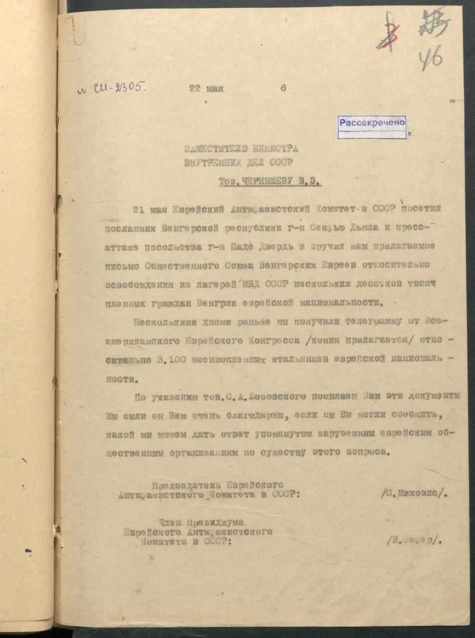 В письме на имя заместителя главы МВД Чернышева представители ЕАК сообщают о контактах с посланником Венгерской республики, который передал просьбу Союза венгерских евреев освободить из заключения венгерских пленных еврейской национальности. Судя по письму, в лагерях для военнопленных содержалось несколько десятков тысяч венгерских евреев. Одновременно сообщается о 3100 евреях из числа итальянских военнопленных, за которых хлопотал американский Еврейский конгресс.