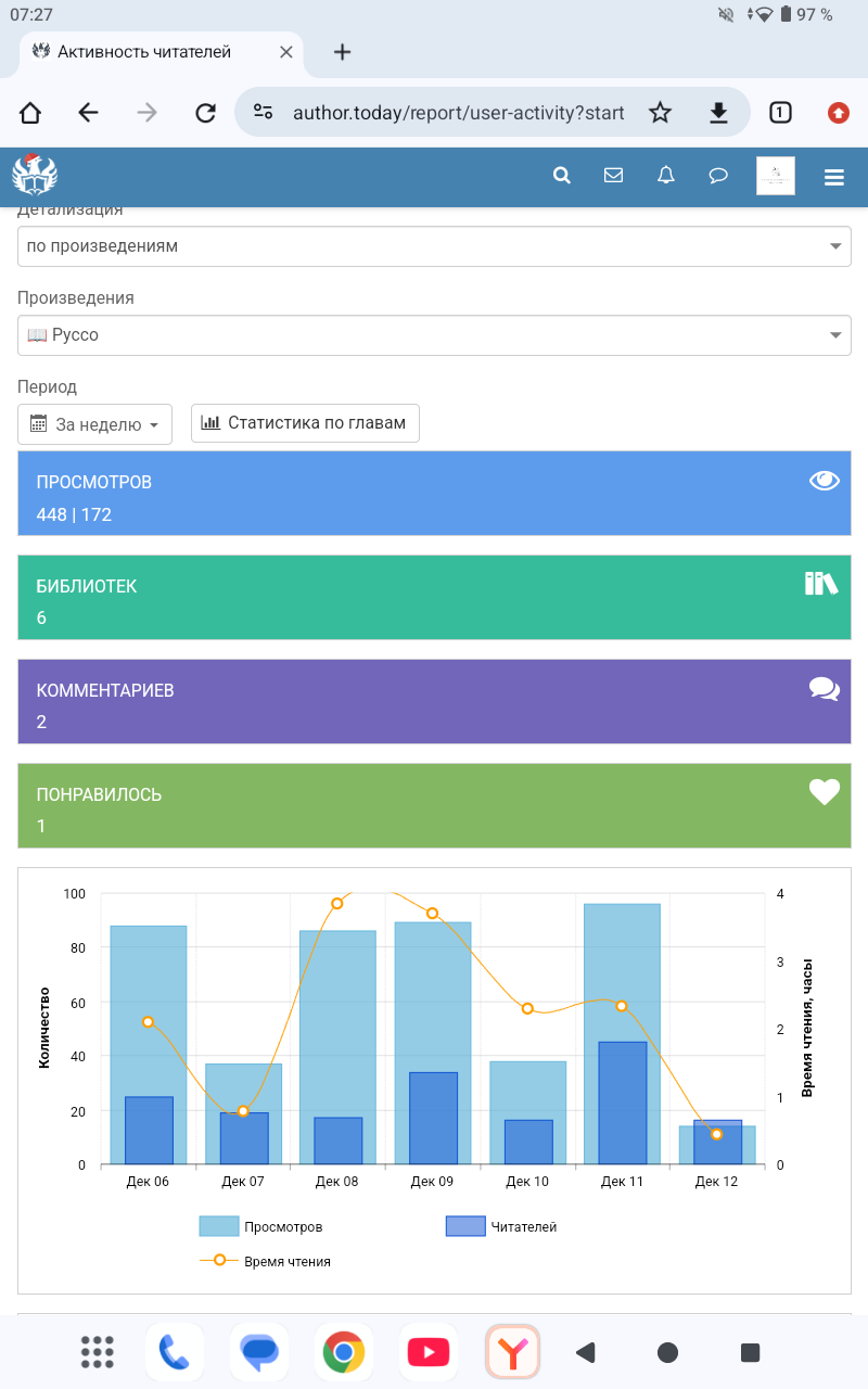 Автор: Артур БезграмотныйВсего символов в книге "Руссо" ( https://author.today/work/490459 ) - 644718 (+15311). Осталось 355282 (17764 в день).