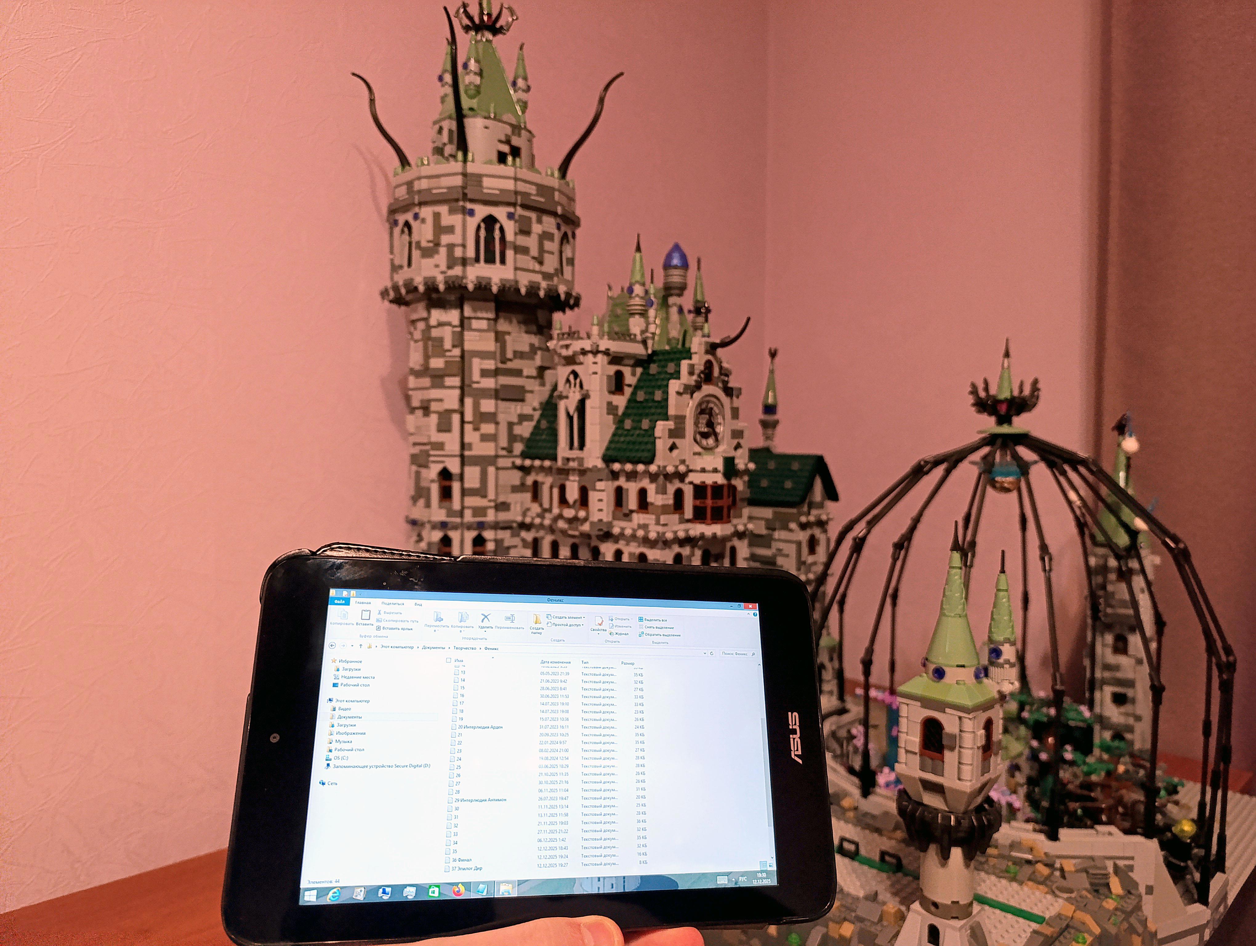 Планшет, на котором я пишу, на фоне Тёмного Замка из LEGO.