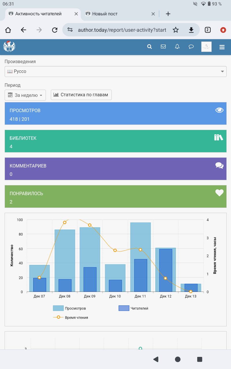 В целом, динамика развития книги мне нравится, есть дни когда люди сидят и читаю мою книгу (очень удивлен), просмотры страницы книги тоже растут, ещё немного и будет уже 3к. Добавилось ещё одно сердечко.