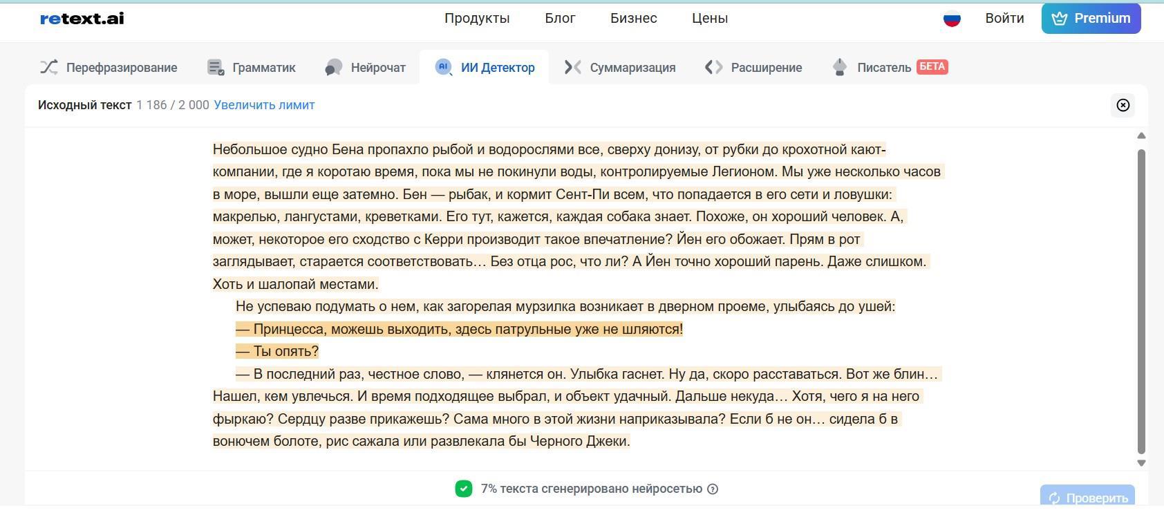 Рука-лицо... И ничего, что этот отрывок написан в далеком 2016, когда нейросетями еще и не пахло )) Не сомневаюсь, что со временем этот процент начнет расти. ИИ будет учиться и находить все больше "своего" в живых текстах. К сожалению. И скоро никто ничего уже отличить не сможет. Зато операторы пишущих машин смогут гордо и бестрепетно именовать себя писателями, потому что фиг предъявишь.