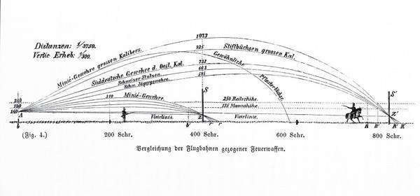 Швейцарская же винтовка не позволяла применять эту тактику благодаря очень отлогой траектории полета пули. На картинке выше показаны траектории пуль разных винтовок. Швейцарская с установкой прицела на 400 шагов(320 м) обеспечивает поражение поясной цели (пехота) не меняя прицела и точки прицеливании(в пояс) на дистанции до 400 шагов (320 м).