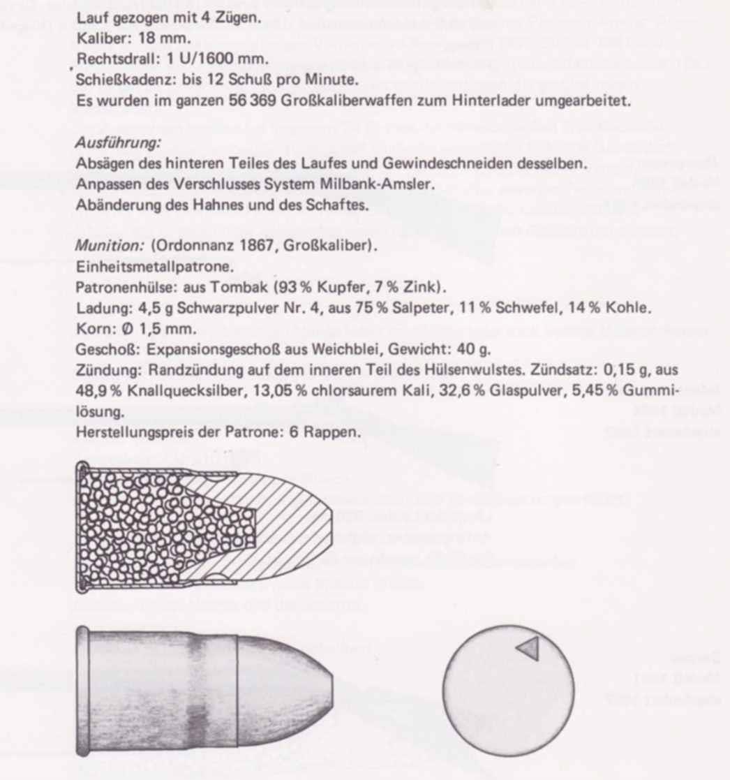 Патрон 18x25 мм Milbank-Amsler был с латунной гильзой бокового боя. Вес пули - 40 грамм. Вес порохового заряда - 4,5 грамма.