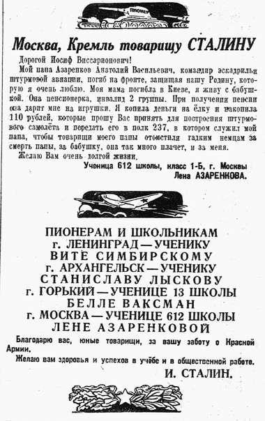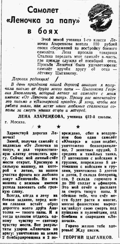 Штурмовик Ил - 2 с надписью "От Леночки за папу" летал и уничтожал фашистов до лета 1943 года, пока не был подбит и сел в тылу врага, лётчик Цыганков вышел к своим, и получил другой Ил - 2.