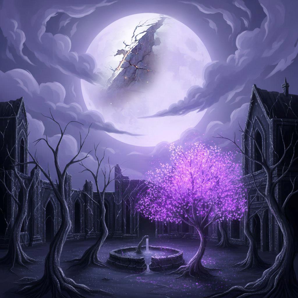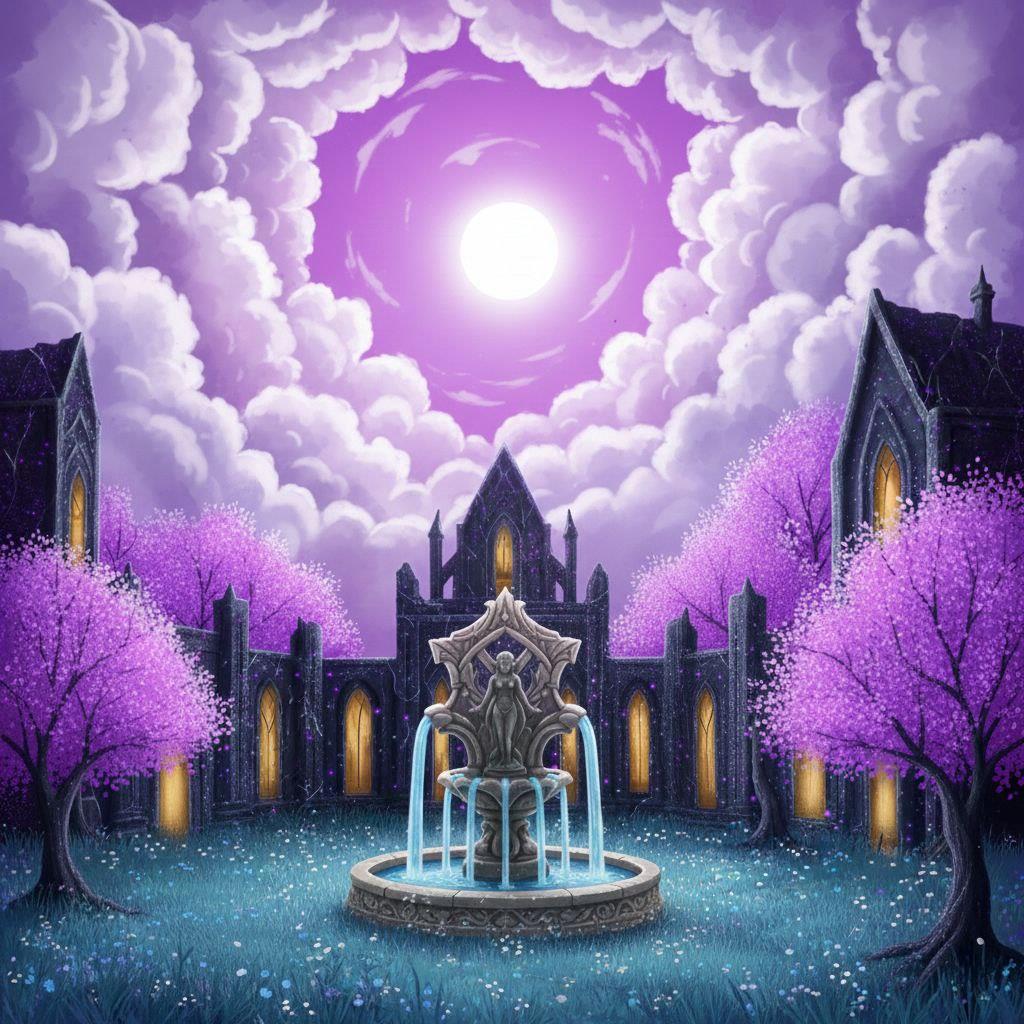 В центре фонтана, который только что выглядел сухим, тонкой струйкой текла вода. Вокруг него на небольшом островке земли раскинулась живая полянка: одно дерево, ветви которого покрывала сиреневая листва, слегка светящаяся в ночи, и голубовато-зеленая трава, мягким ковром покрывавшая землю вокруг него.