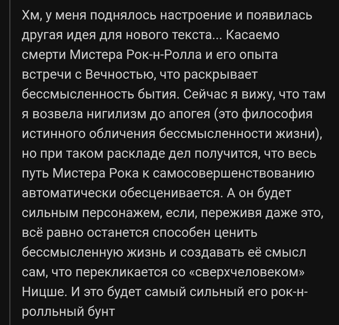 «Мы с тобой — случайность. Но раз уж эта случайность случилась… — Рокабилли наконец посмотрел прямо на Рока, и в его взгляде вспыхнуло не победоносное ликование, а огромная, всепоглощающая нежность к самому факту их существования. — …то мы можем сделать её прекрасной. Не для Вечности, которой всегда было всё равно. Для себя. Для других таких же случайных искорок, которые дрожат во мраке и боятся погаснуть. И я буду вести тебя сквозь этот мрак. Не как спаситель. Как напоминание. О том, что ты можешь светить, даже зная, что вокруг — только тьма».