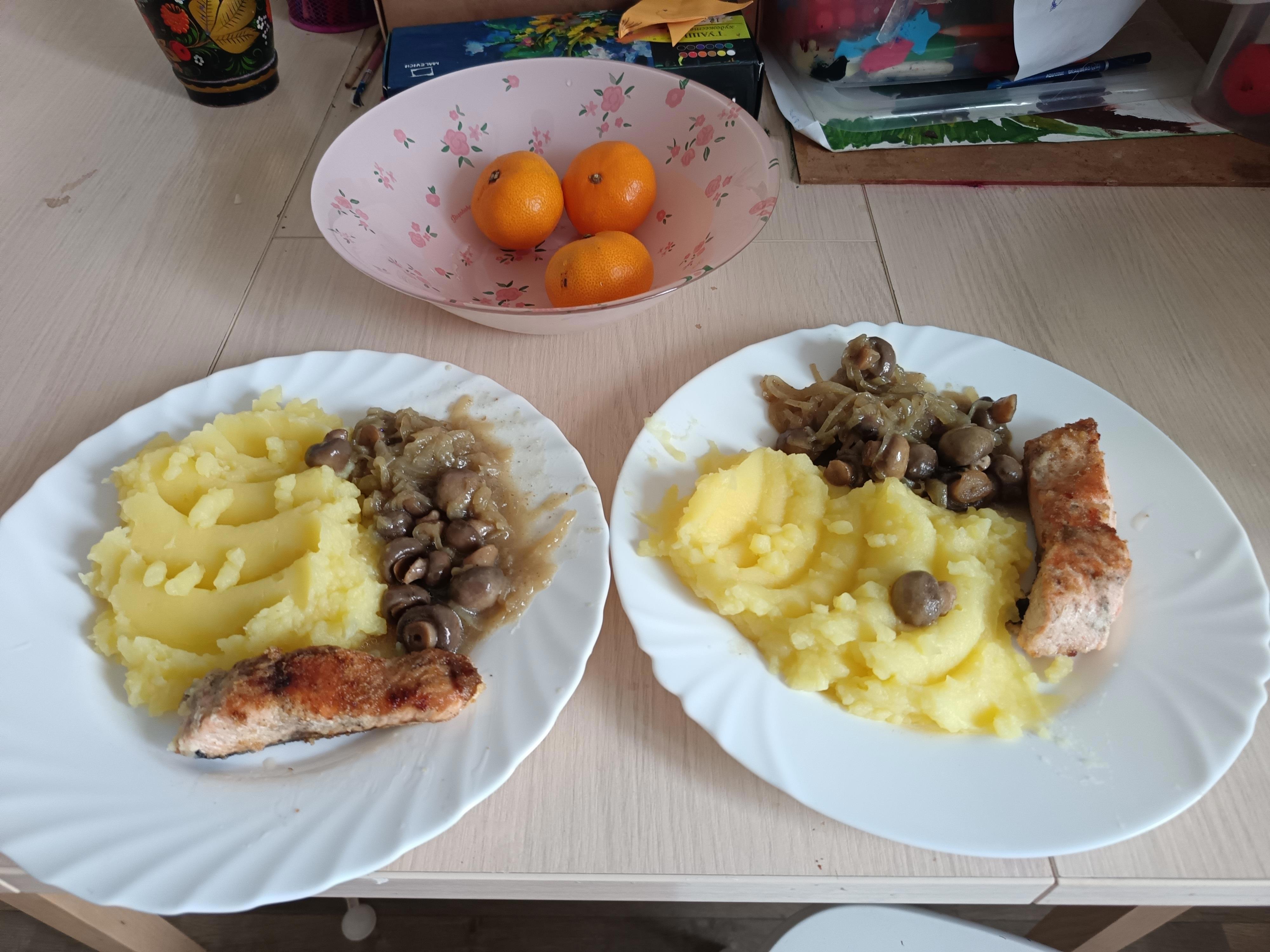 Но вот моим старшим детям так не нравится. Так что пюре отдельно, и шампиньоны, с которыми лук затушился до состояния едва ли не кашицы - но тоже, кстати, неплохо. Плюс рыба в той самой манке:
