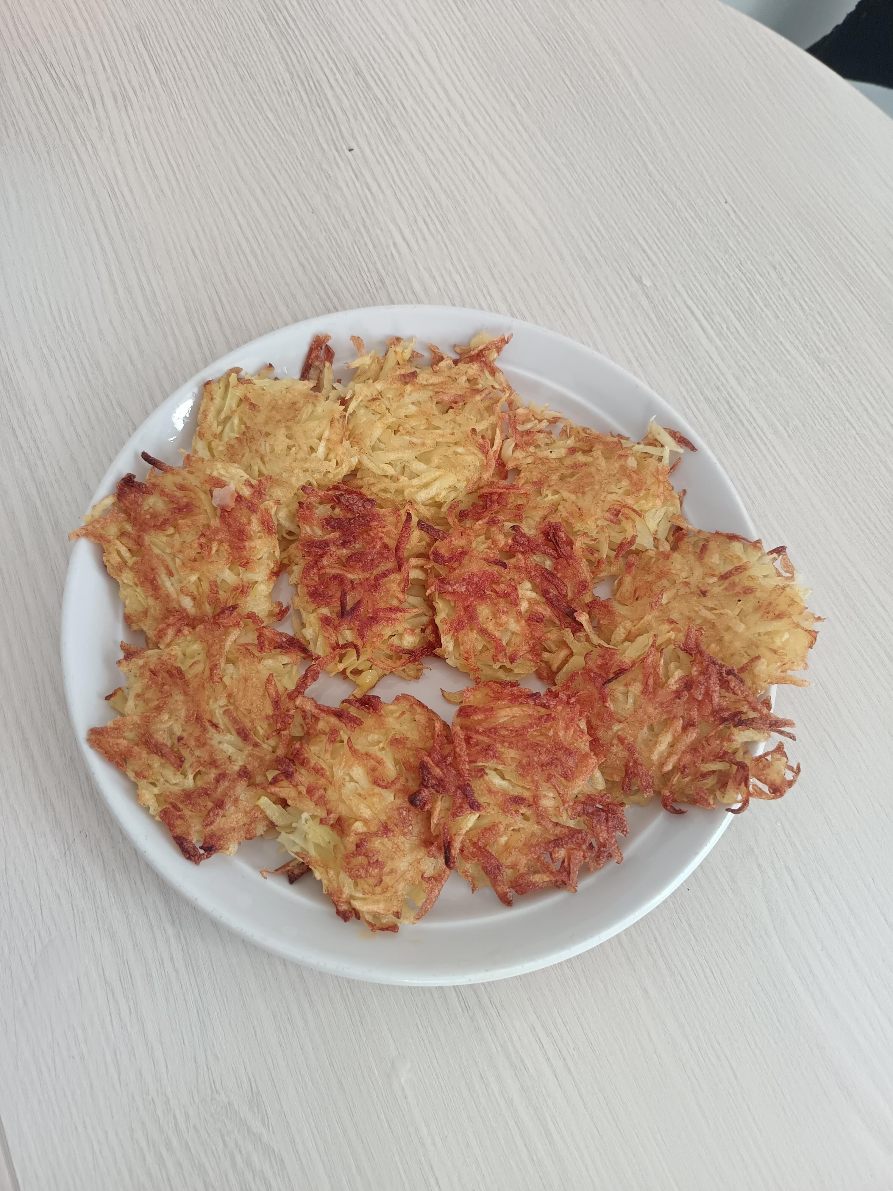 1) Драники, они же тертики. Люблю именно постные, готовить их просто - после того, как натерли (в последнее время использую именно крупную терку) нужно картошку посолить и немного подождать. Она даёт сок, много сока - и вот хорошо отжав в ладони картофельный оладушек, выкладываю его в на разогретую сковороду, где немного обжарил (и сразу убрал) чесночок. От тертого лука в драниках я также отказался, горит. Обжариваю хорошо, до золотистой корочки с обеих сторон; как раз для того, чтобы как следует схватился.