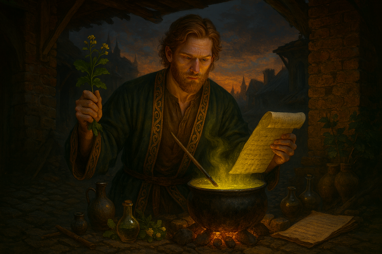Алхимик Торальв, забрав древний свиток из библиотеки, не смог его прочесть. Часть текста выцвела (а быть может кто-то специально испортил). Но он знал способ вернуть ему яркость - он же алхимик! Алхимическую лабораторию он собрал в палатке на закрывшемся рынке, как говорится, на коленках. Но всё же она вполне себе тайная, ведь он скрылся от чужих глаз. И тут ему как раз пригодилась трава из 9-го задания марафона. :)
