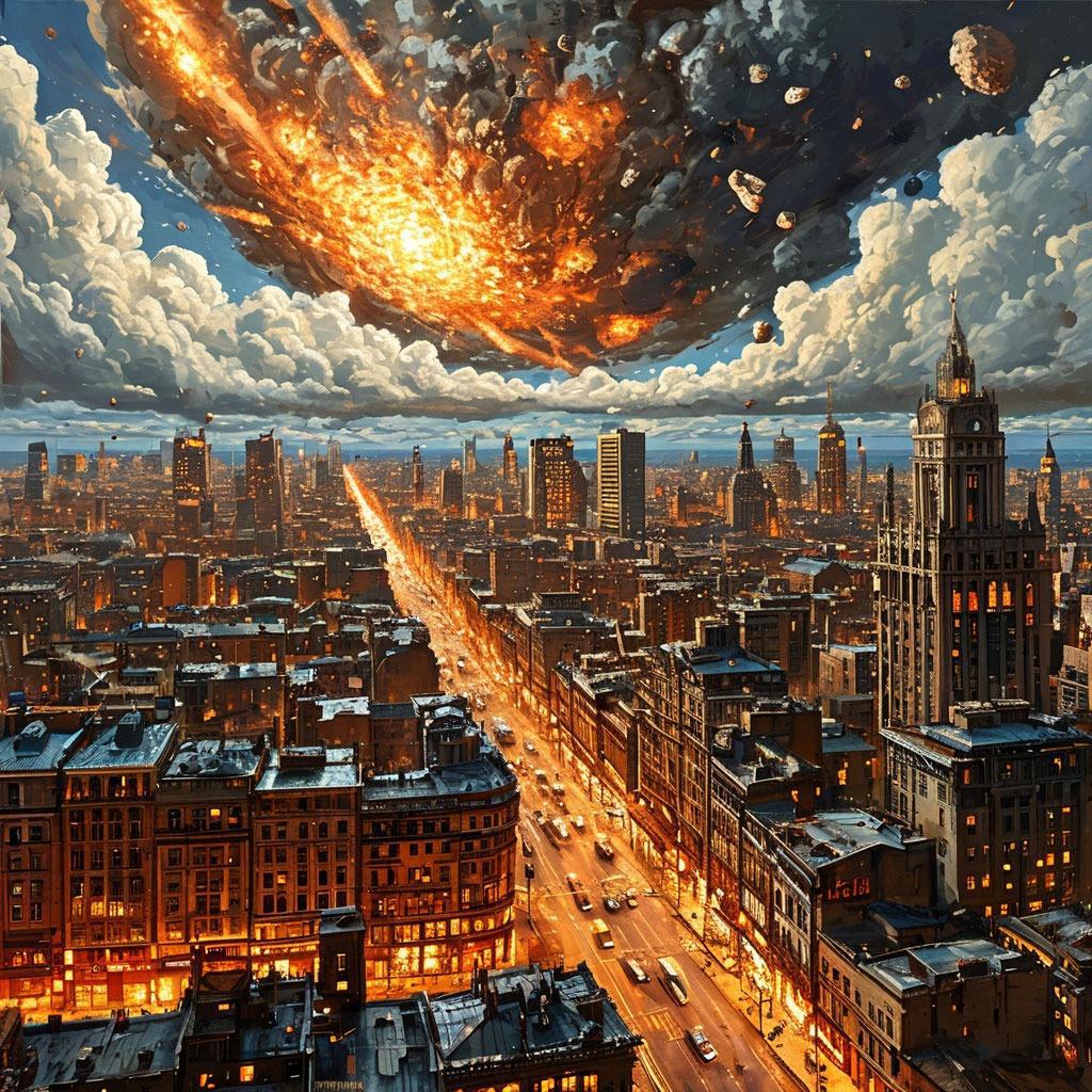 Вслед за лучиком облака прорезала сверкающая глыба, которая стремительно увеличивалась в размерах, пока не стала величиной в полнеба. Казалось, она летит прямо на это здание, но метеорит пронесся гораздо выше. Даже на таком расстоянии стекло обдало жаром, что наблюдательница отшатнулась. Стекла задребезжали, но выдержали. Метеорит упал в нескольких кварталах от офиса, хотя упал, это неправильное слово. Сначала он пронесся по небу, а потом просто накрыл собой несколько домов.