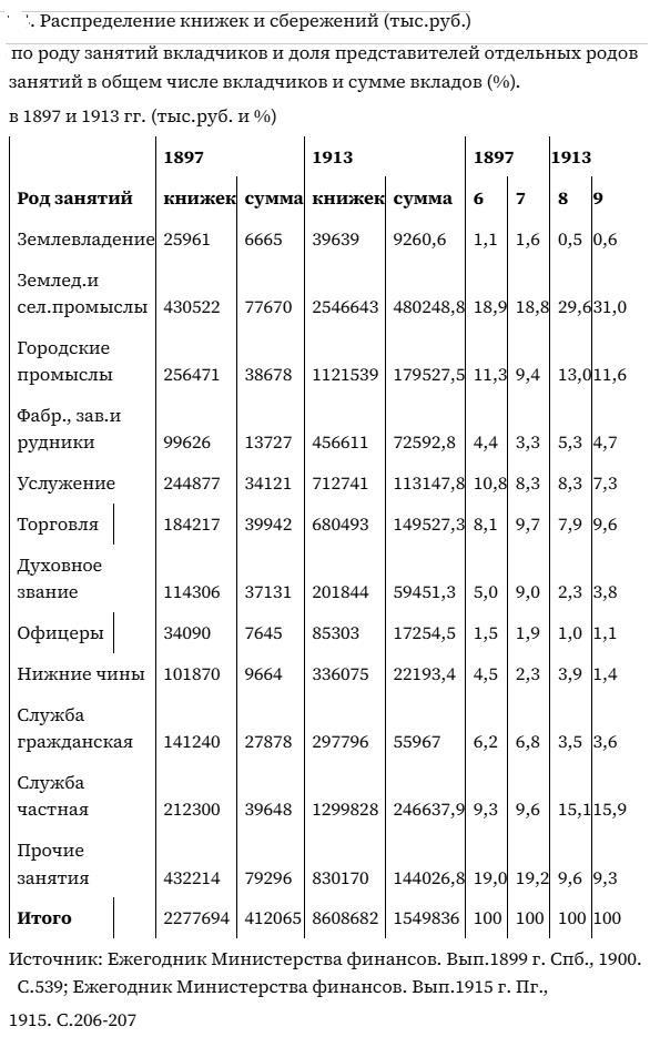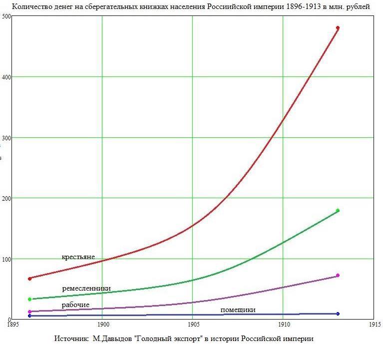 Все эти сбережения трудового народа, товарищ Ленин потом экспроприиирует в пользу бедноты. График построен по таблице 14 из лекции историка М. Давыдова "Голодный экспорт" в истории Российской империи. В 1913 году у крестьян было 2 546 643 сбергательные книжки. Если считать, что одна книжка приходилась на семью в 5 человек, то книжки имели примерно 15% крестьян (с вычетом тех крестьян, что служат в армии, работают в городе и т.д. так как их книжки учитываются отдельно).