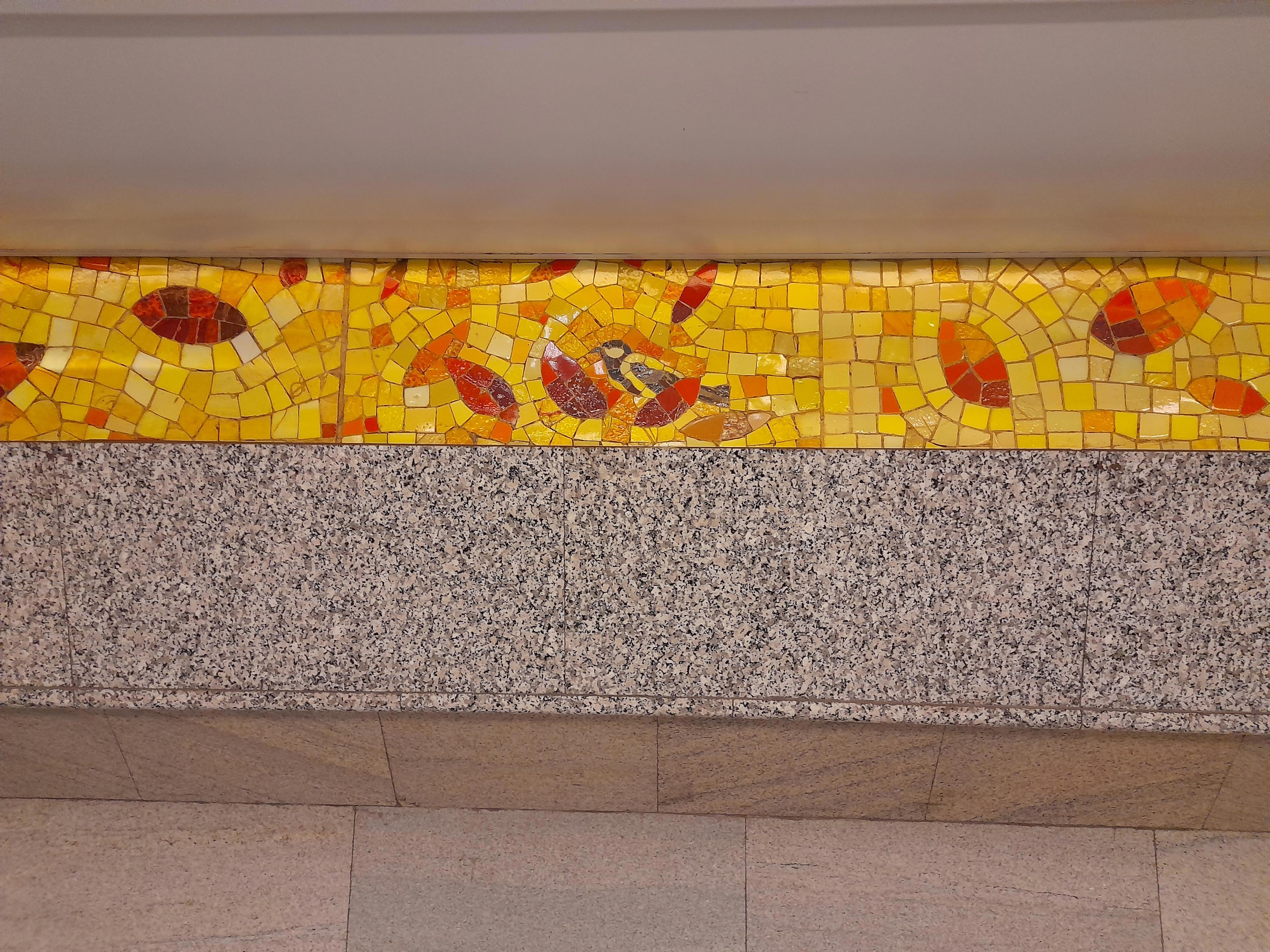 Автор: Николай БергНа станции метро "Бухарестская" идет полоса мозаики с растительным орнаментом. Но в одном месте спрятана птичка.
