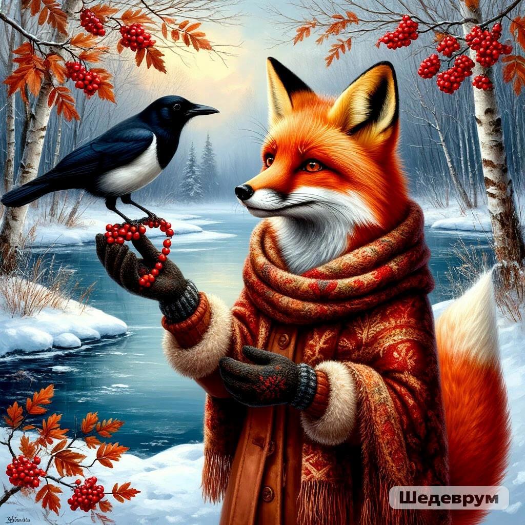 Лиса нашла болтушку около реки: Сорока пыталась вытащить что-то блестящее из тяжёлого сугроба. Выслушав Патрикеевну, птица хитро прищурила один глаз и торопливо проговорила: