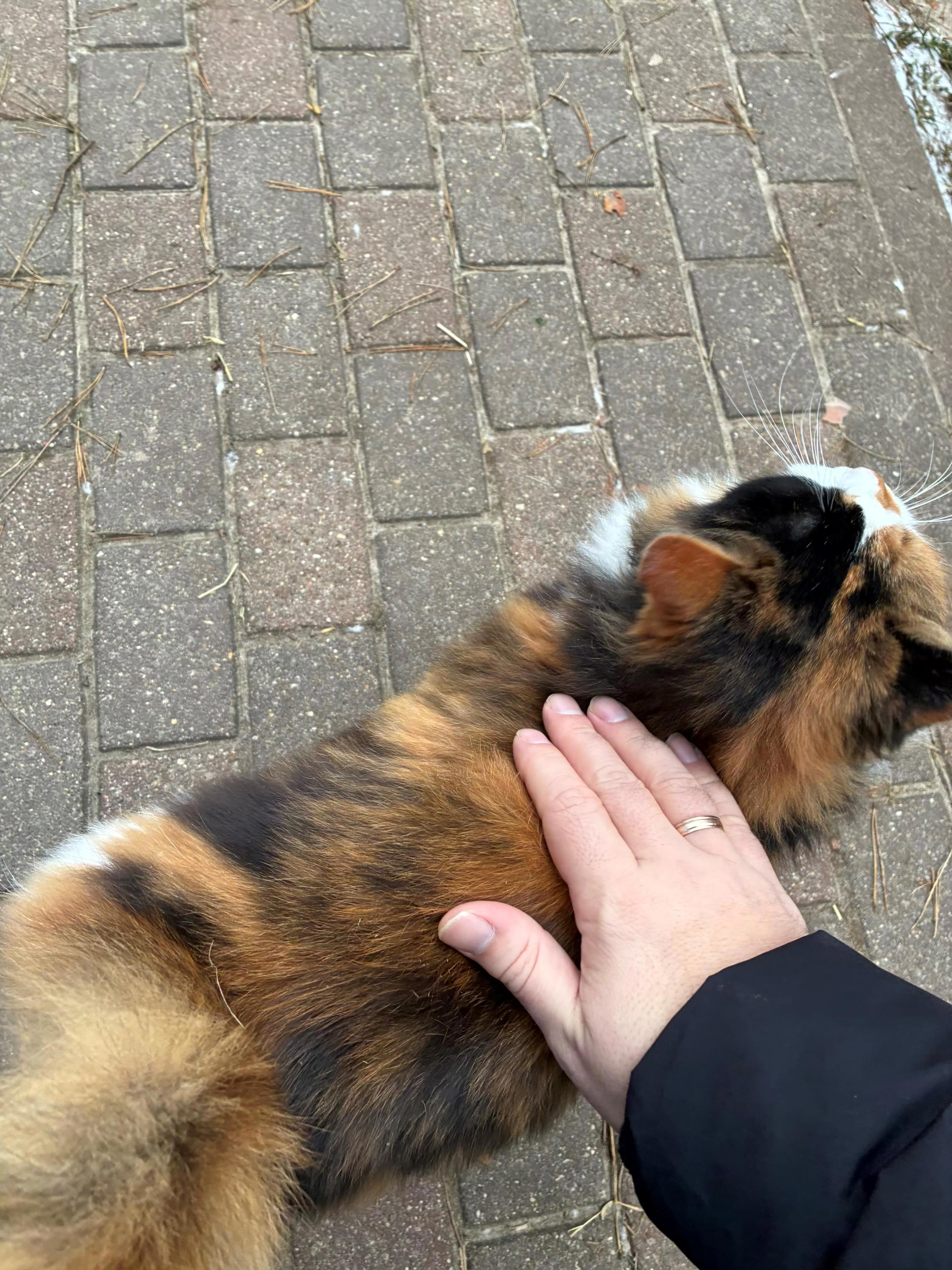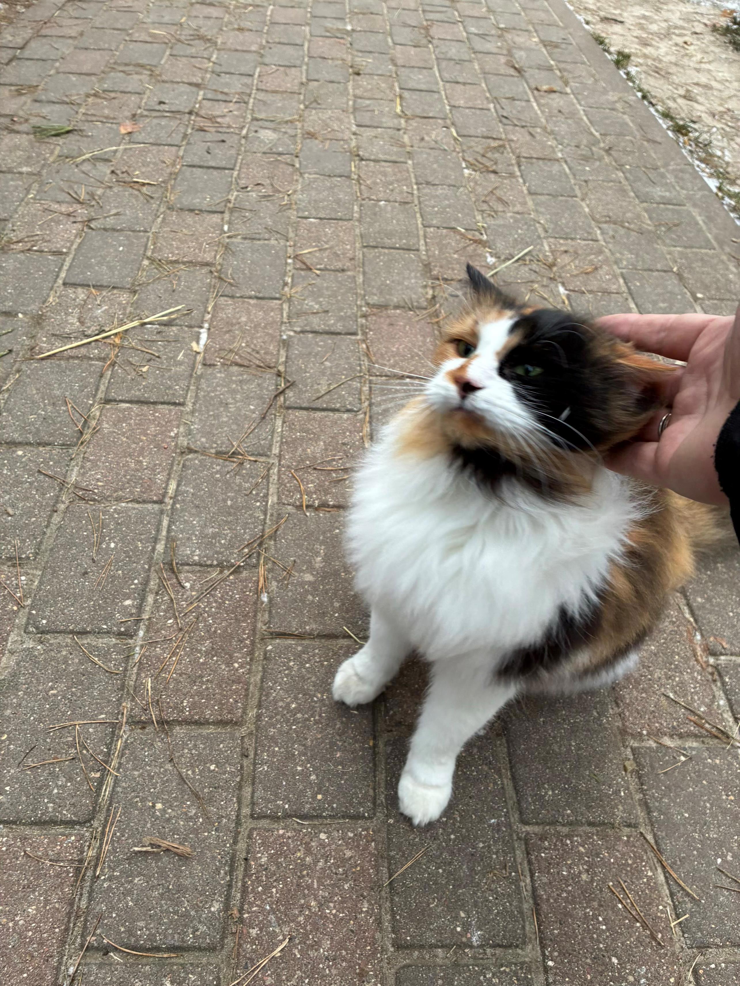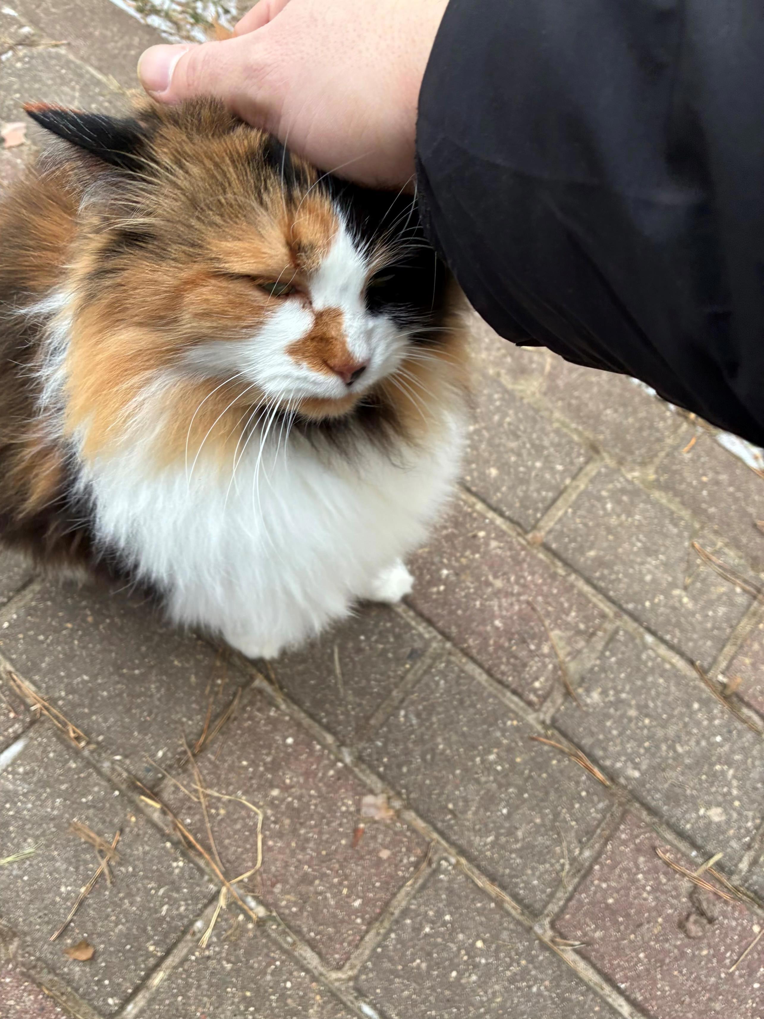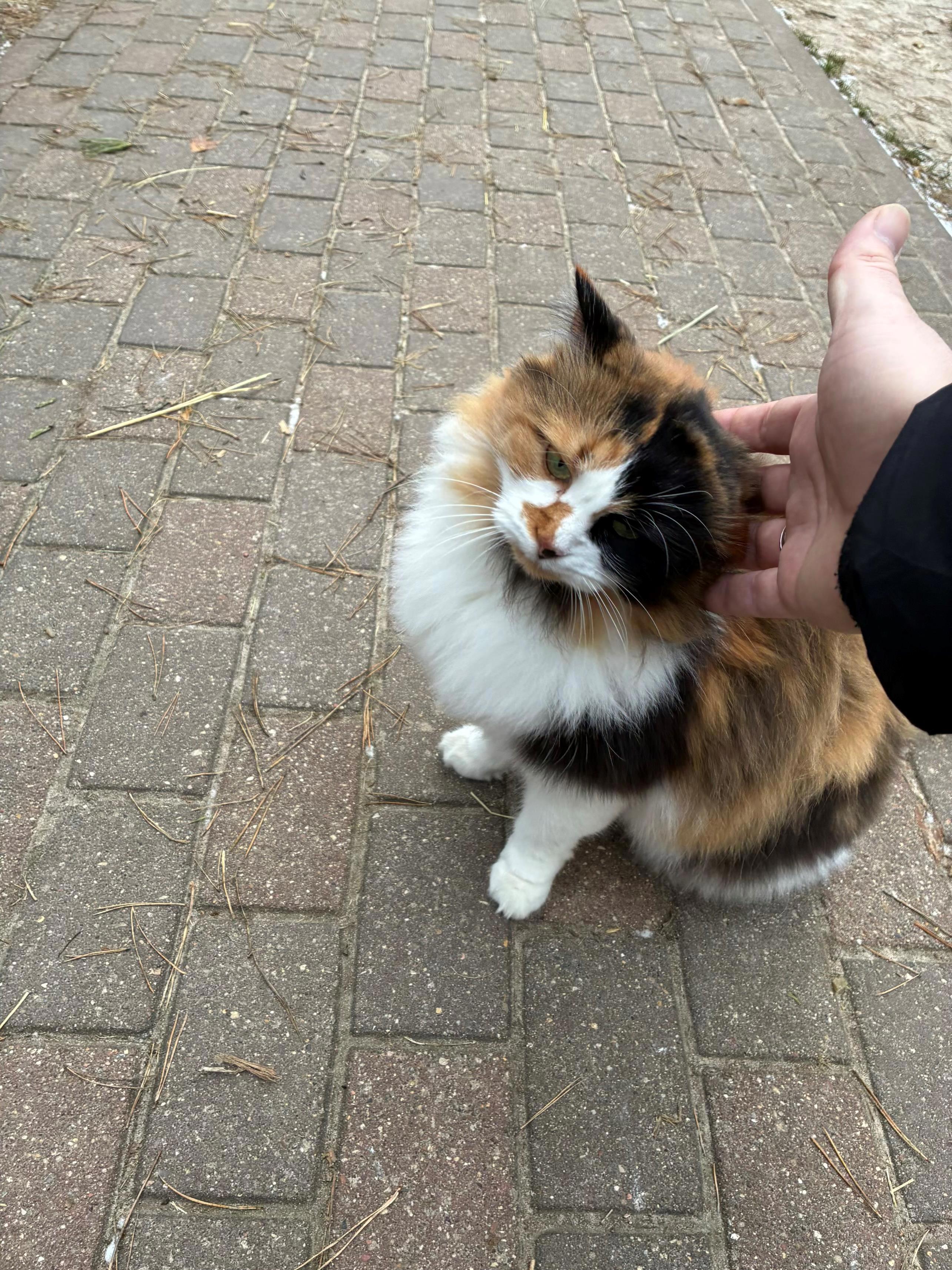 Подозреваю что это чей-то домашний кот, которому хозяева дозволили гулять самому по себе, иначе бы он хрен бы позволил себя погладить. А этот сам ходил от прохожего к прохожему и напрашивался на ласку.