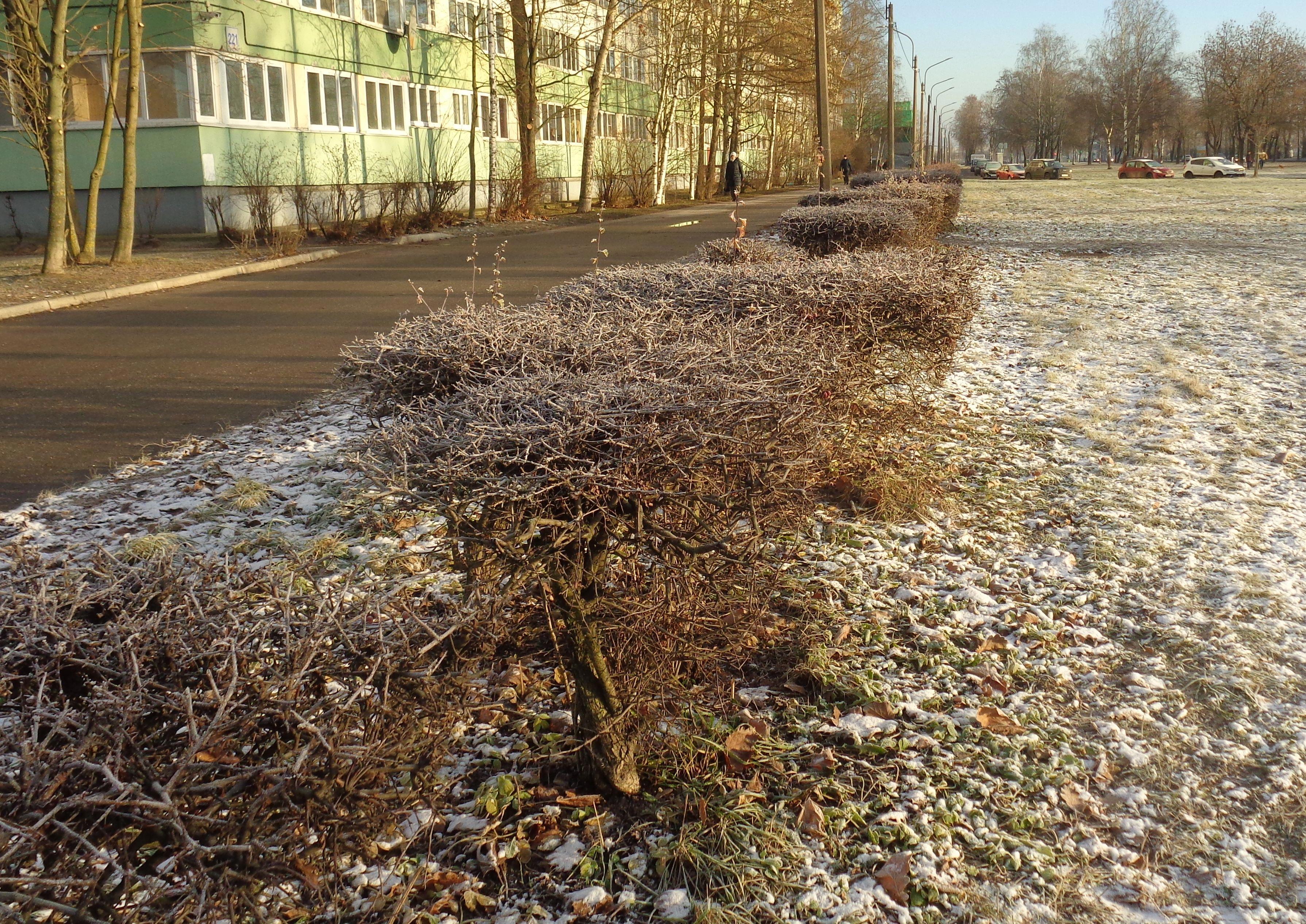 Стриженые кусты боярышника на аллее по пр. Народного Ополчения.