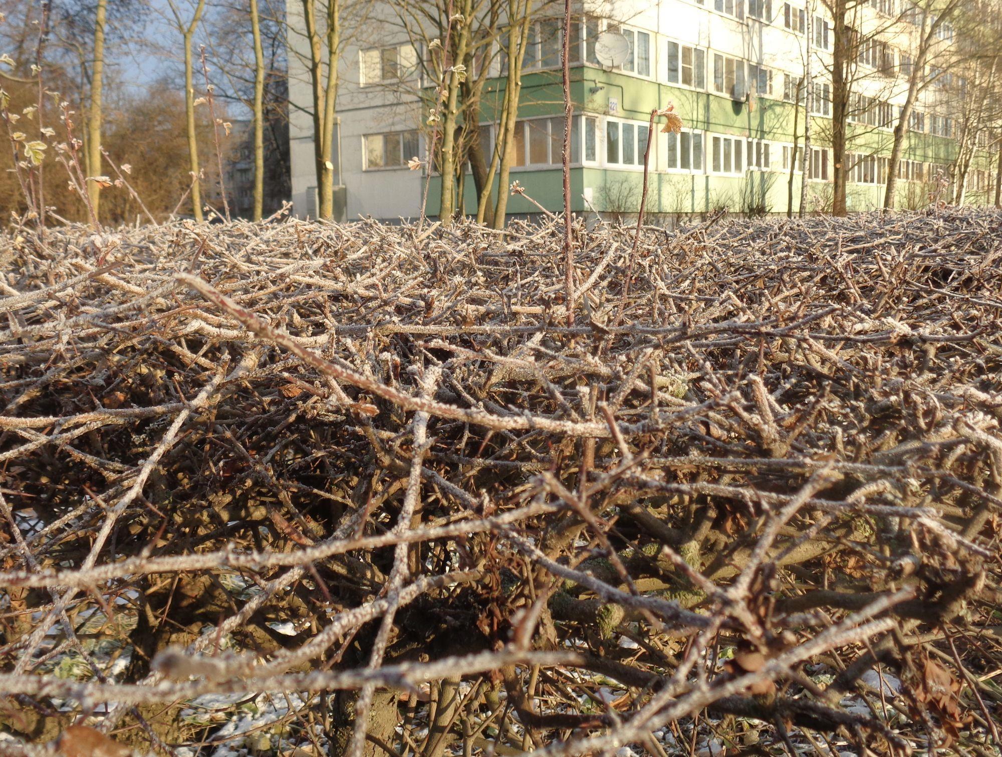 Это не валежник и не дрова. Это заиндевевший верх стриженых кустов боярышника.