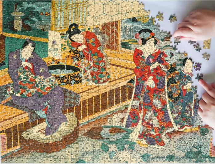 Но больше всего сдвинул нам мозги набекрень первый в жизни пазл — головоломка, в которой изображение собирается из криволинейных кусочков. Он был огромен — примерно метр на метр. Изображал японский пейзаж: серо-синее небо переходит в серо-синие горы, которые спускаются к серовато-сине-зеленым лугам, на которых растут серо-синевато-зеленые деревья, вплоть до берега серо-сине-зеленоватого моря. Ни тебе пагод или каких ярких элементов — только монотонные небо, скалы, деревья и вода.
