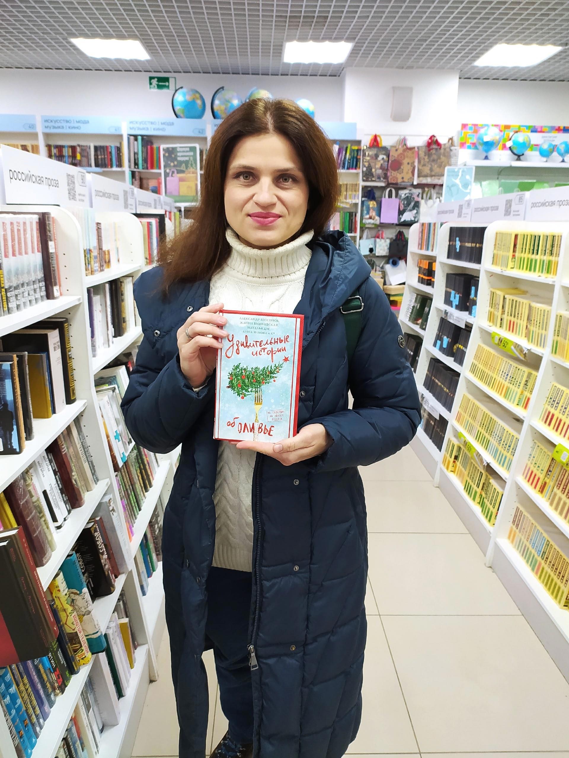 И вот моё имя можно прочитать на обложке одной из книг. Пока ещё в компании с другими, пока ещё не на «кубике», но через порог-то я уже перебралась. И как видите, работники магазина любезно помогли мне с мини-фотосессией.
