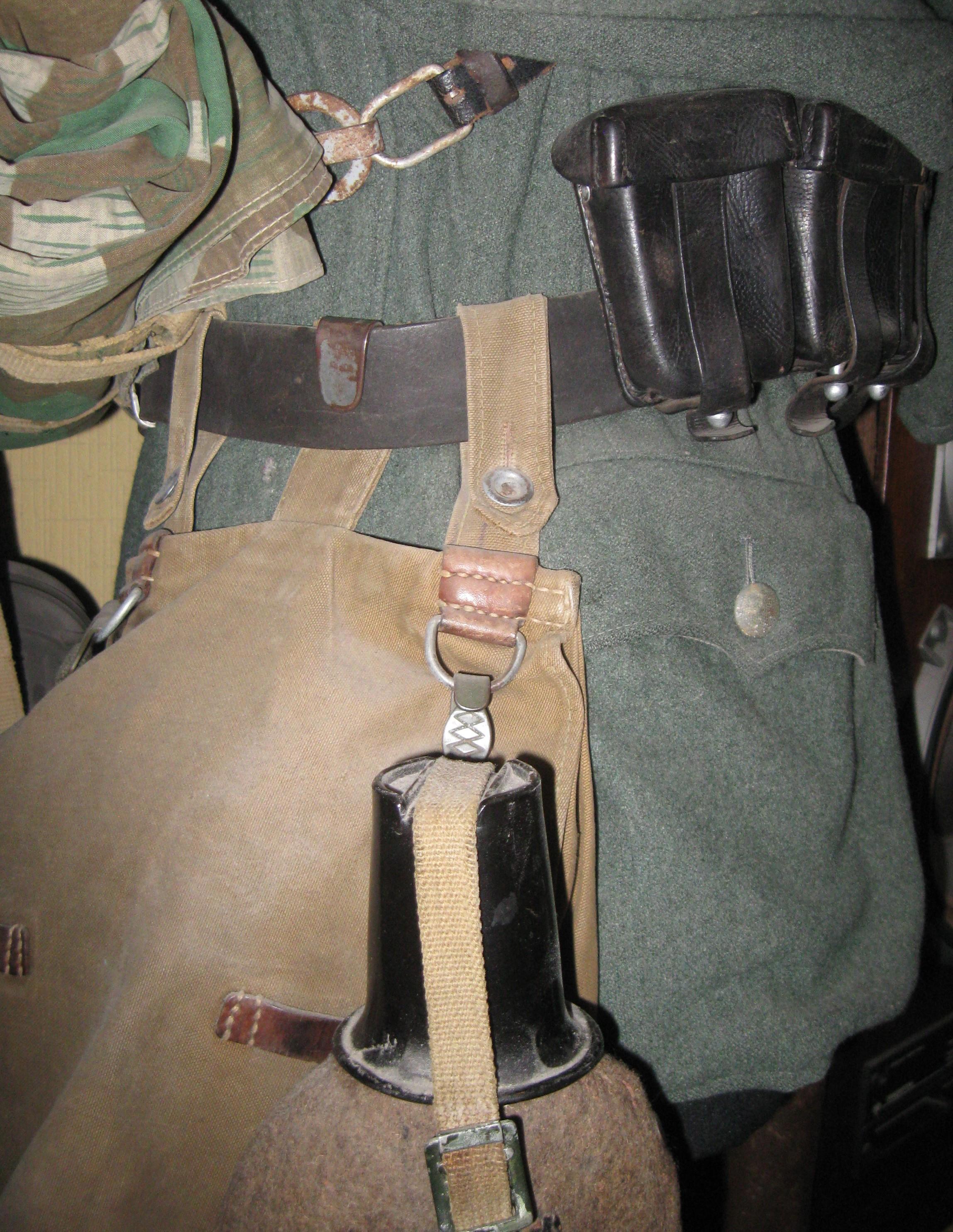 В вермахте для рядового использовалась иная конструкция ремня. Изготовлялся он из толстой черной кожи, был снабжен алюминиевой/стальной двузубой пряжкой. Но, зубья эти были маленькими и для закрепления ремня существовал дополнительный узкий хлястик с отверстиями. Поскольку зубья были маленькими, то они часто выскакивали, что составляло определенные неудобства. Ремень был снабжен крючком для сцепления с петлей на обратной стороне пряжки. Ремень также использовался для ношения всякого рода снаряжения, как то патронные подсумки, штык-нож, саперная лопатка, сухарная сумка и пр. Поскольку снаряжения было много, то для облегчения носки использоваласьY-образная разгрузка.