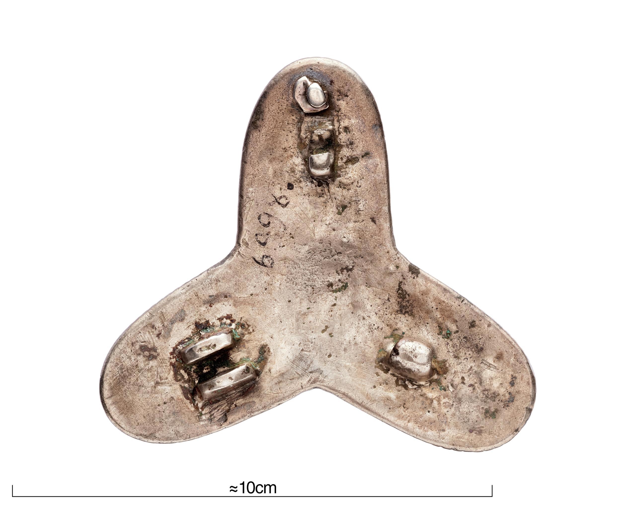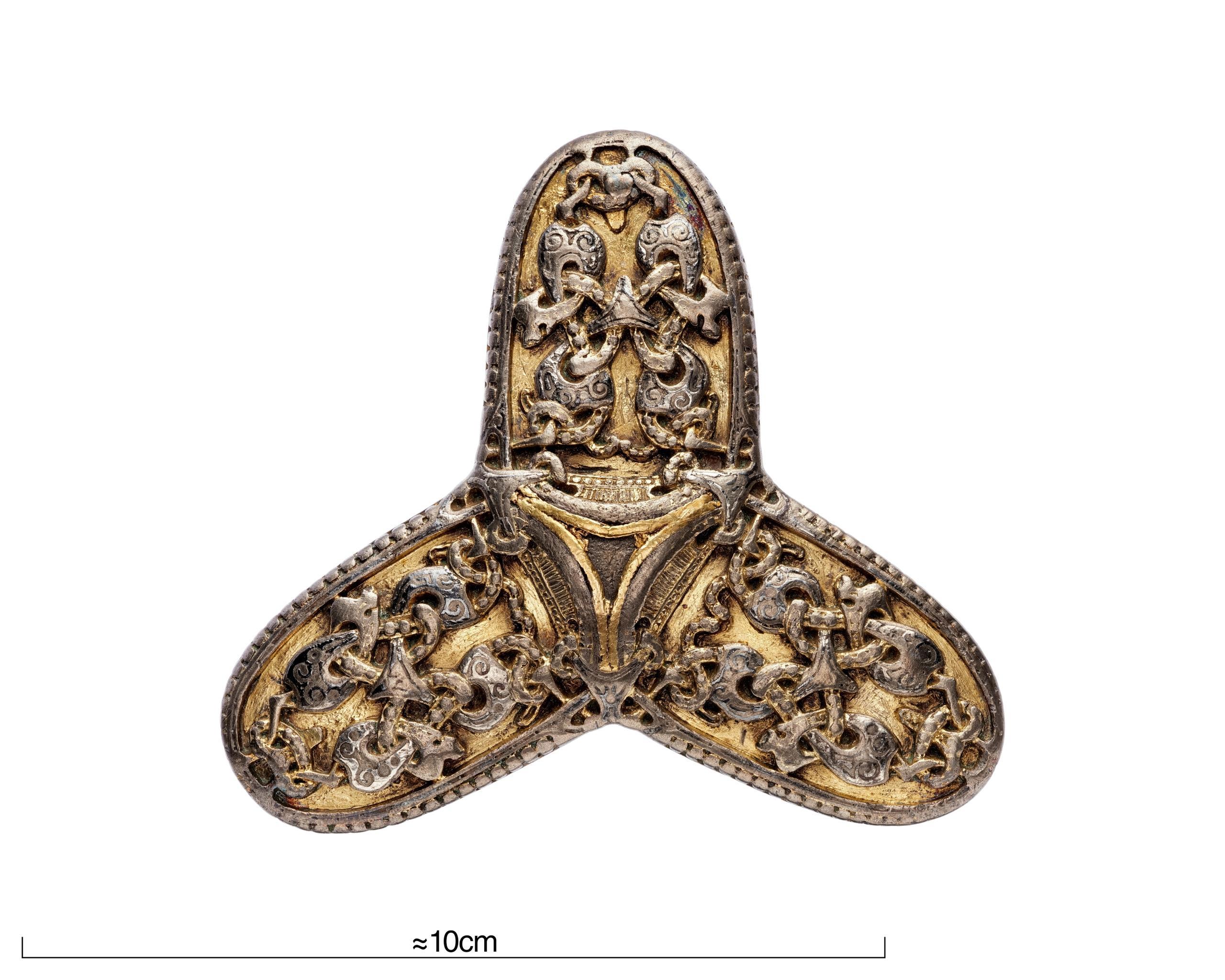 Трехлистная фибула с орнаментом в стиле Йеллинге из состава небольшого клада из Эстра Херрестад в Сконе (Южная Швеция). Размер - 90х67 мм, материал - серебро, позолота. Вероятная датировка - X век.