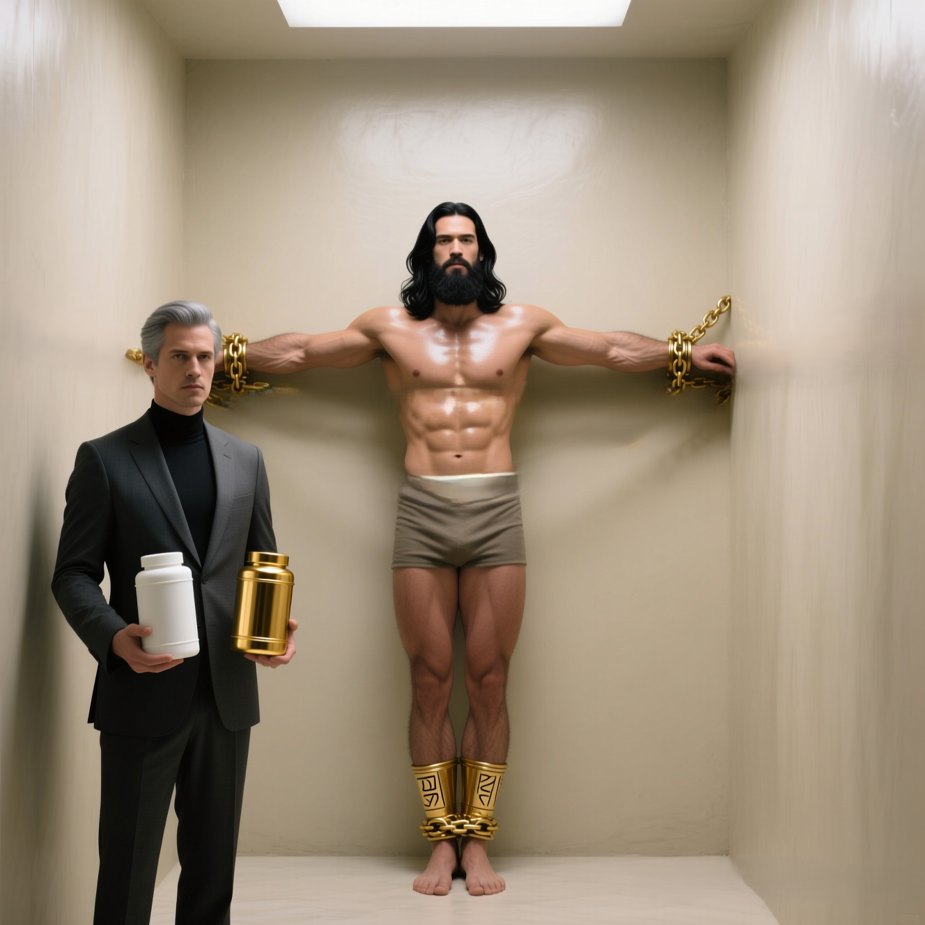 От массивных браслетов на его лодыжках и запястьях тянулись толстые, кажущиеся невесомыми цепи из тусклого жёлтого металла. Они не были натянуты и терялись в специальных гнёздах в стене. Цепи были золотыми. Настоящее, чистое золото, но обработанное так, что оно не слепило, а лишь тускло мерцало.