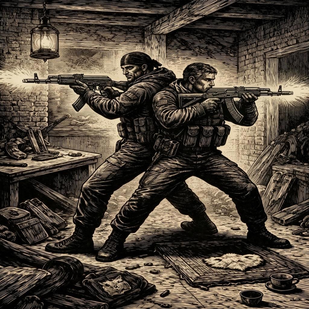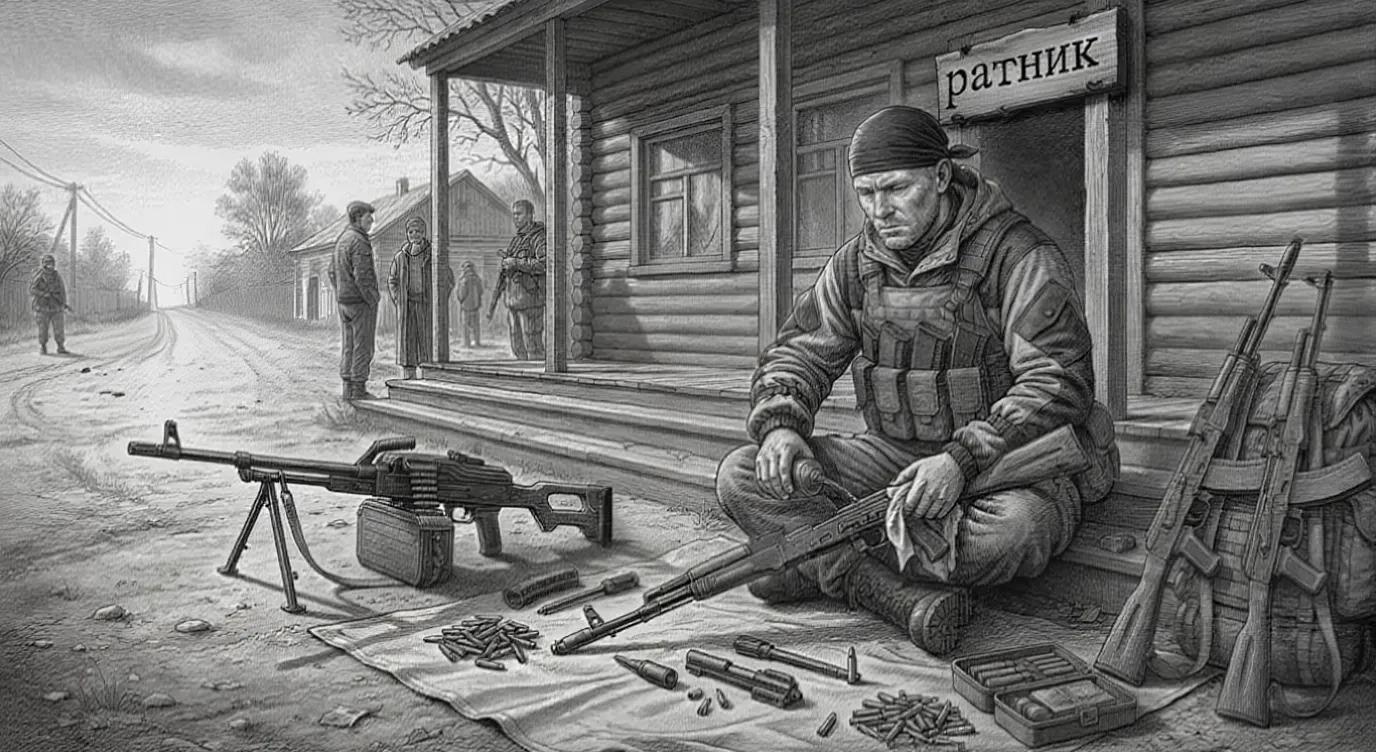 Чистка оружия перед "Ратником". Правда, "нейронка" не сумела нормально нарисовать РПК с "бубном", зато ПКМ нарисовала - моё почтение. Ну, и вывеску ИИ как-то низковато на двери приколотил. :)))