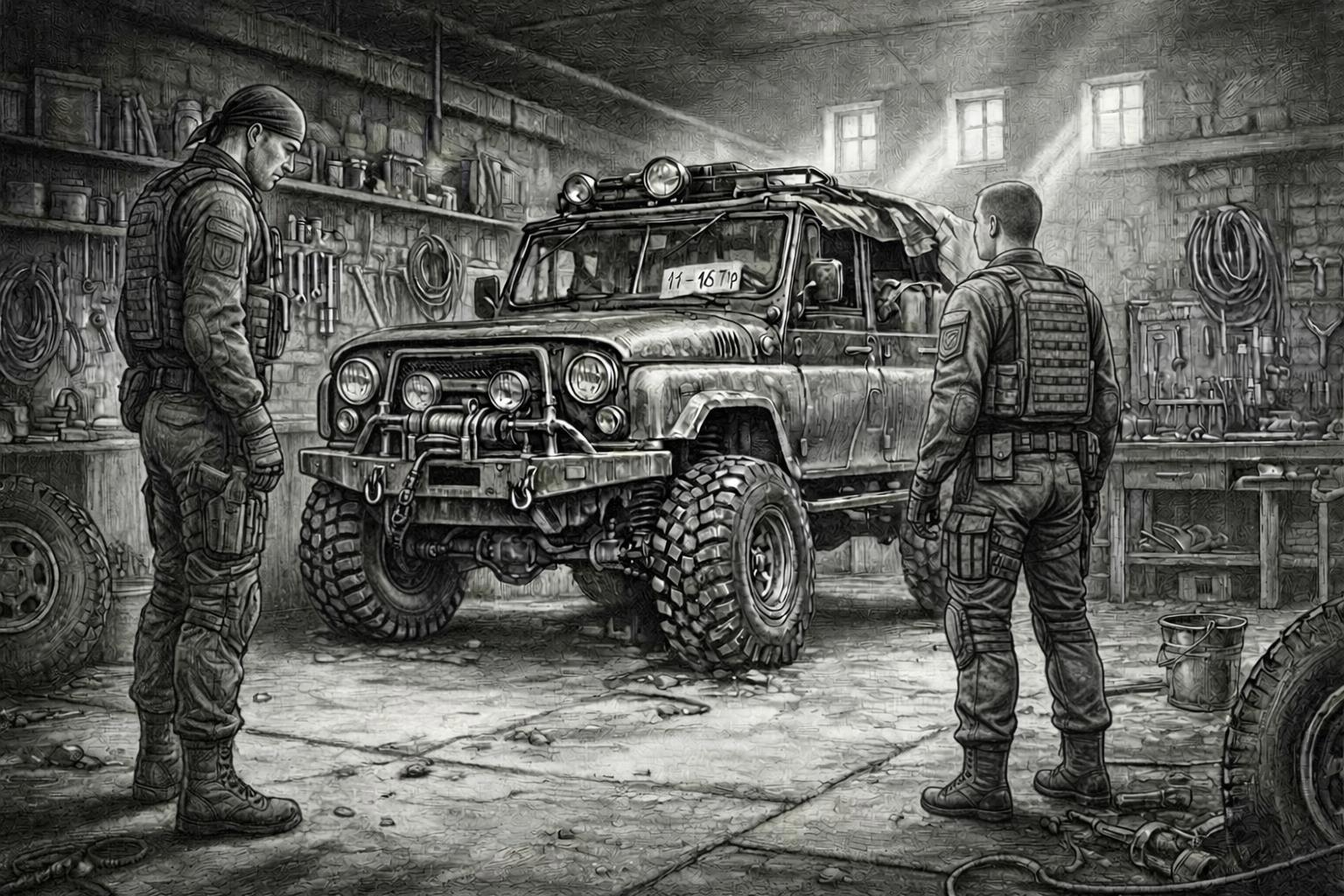 Вторая картинка - Миша приехал за отремонтированным УАЗом. Тут, всё равно, ИМХО, есть небольшая беда с ростом героев, но на предыдущих версиях было похоже, что то ли хоббиты УАЗ покупают, то ли УАЗ хорошо кушал и вырос до размеров "Урала", как минимум. Тут всё же ближе к реальности.