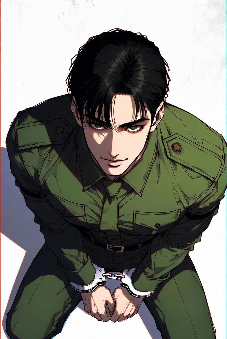 Высокий, широкоплечий, спортивное тело. Чёрные волосы, всегда чуть взъерошенные, тёмно-карие глаза. Лицо усыпано россыпью родинок, будто кто-то рассыпал звёздную пыль. Носит стандартную тёмно-зелёную форму солдат. Его главное оружие - это искренняя и добрая улыбка (а еще сарказм, когда нервничает, и много дурацких шуток)