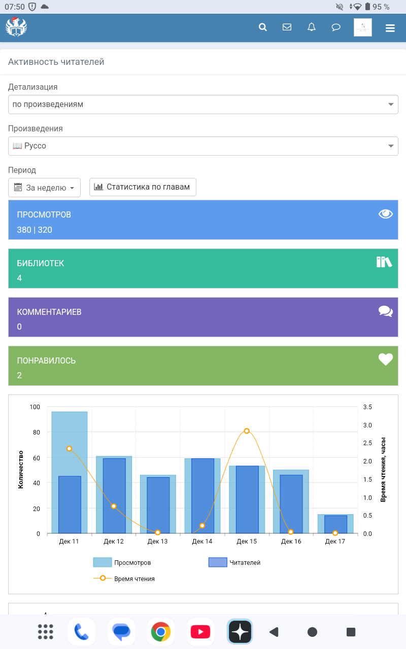Статистика? Напрягает отсутствие времени прочтения при наличии читателей. К тому же, что-то не так с просмотрами/прочтениями. Обычно, у меня просмотров в два раза больше прочтений, а сейчас одинаковое количество. Явно, что-то на АТ не работает, если это сказывается на статистику, а следовательно на продвижение книги, то это очень печально.