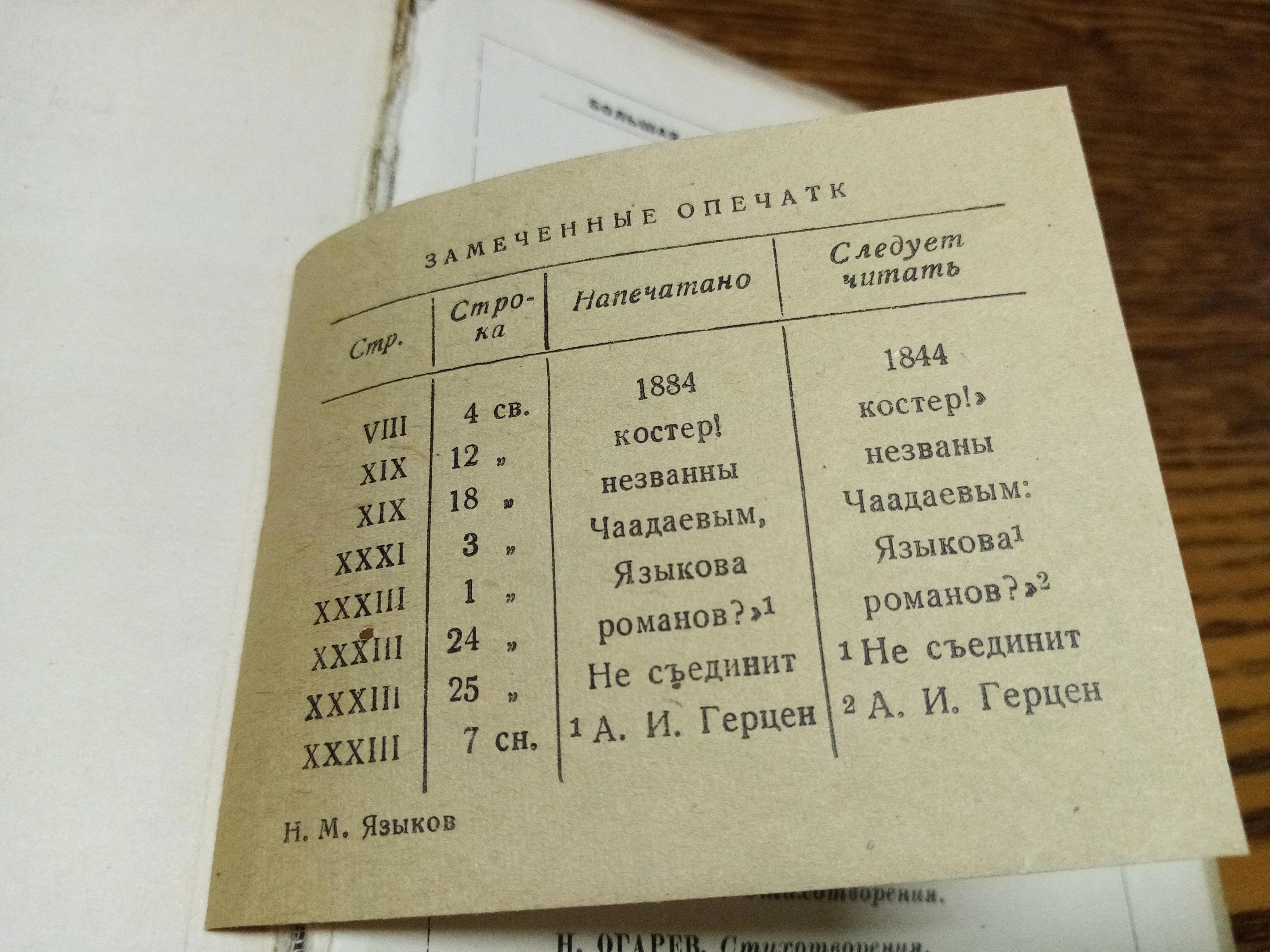 Автор: Ананьин ГригорийНе так давно я наткнулся на сборник стихов поэта Языкова, выпущенный в 1948 году, еще при Сталине. И по существовавшему тогда обычаю в конце книжки был приведен особый лист, где перечислены обнаруженные опечатки. Вот он: