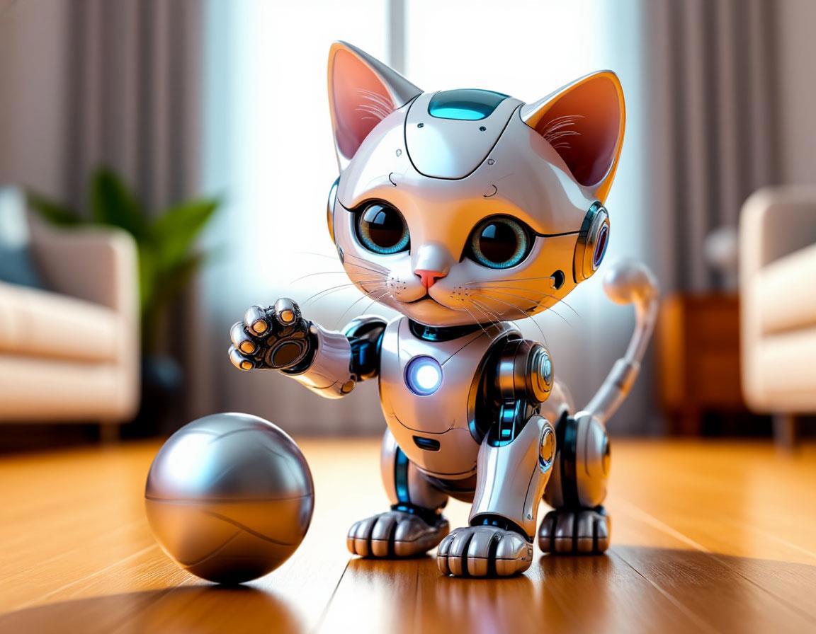 Следующий запрос: «Стиль светлое будущее футуризм, забавный и красивый робот-котенок на полу в квартире играет с мячиком, добрая светлая картинка, футуризм, динамика движение».
