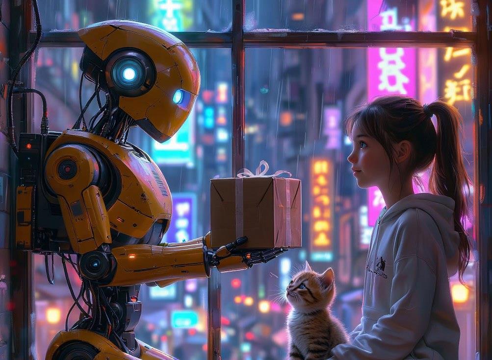 Любопытно вышло. Робот скорее андроид. Зато девочка с настоящим, живым, пушистым котенком рядом. Кто-то принимает упаковку. Робот или девчушка, как считаете? Там наверное ценный подарок. Нейросеть немного намудрила с пальцами девочки. Поэтому я обрезал рисунок по низу.