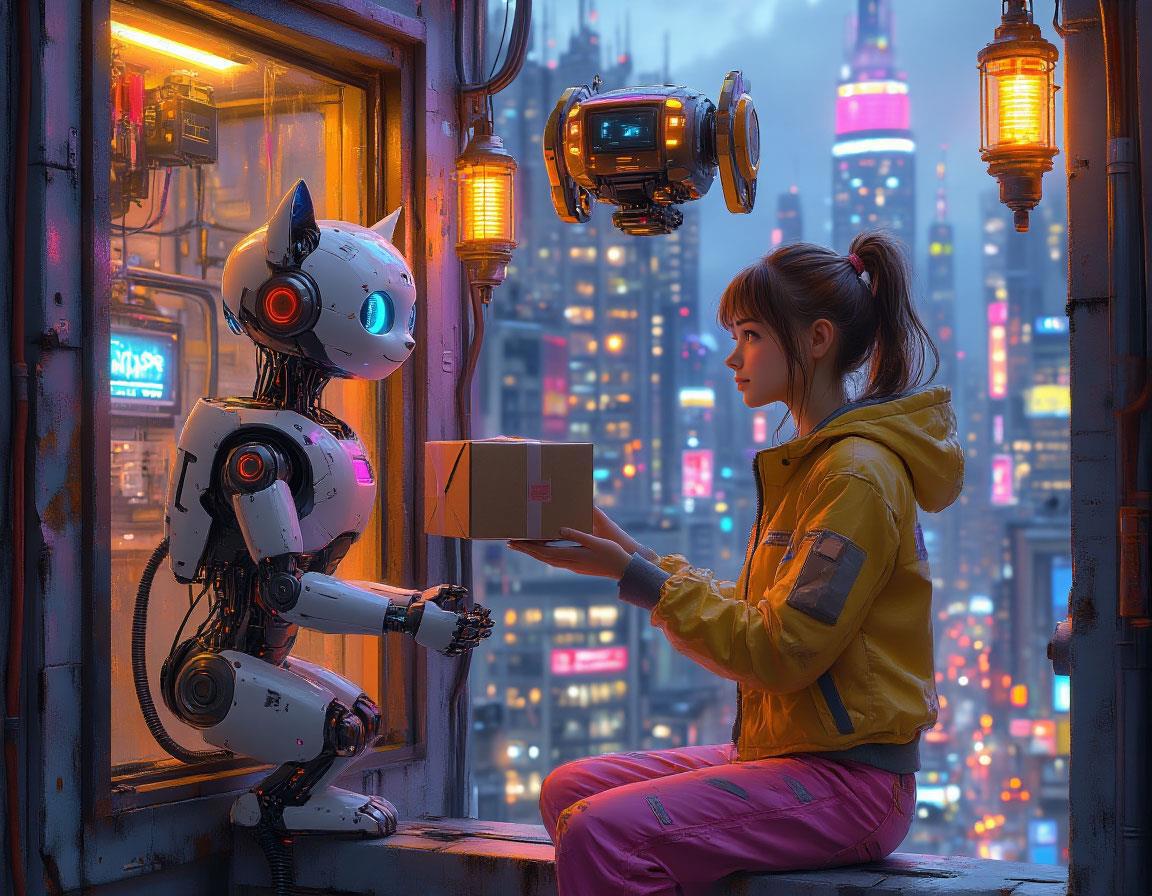Запрос: «Стиль киберпанк футуризм хай-тек, из окна высотного хай-тек дома высунулась девушка в яркой одежде она принимает посылку от летающего робота доставщика, рядом на подоконнике сидит милый робот котенок, вечерний город будущего, горят фонари, огни реклам».